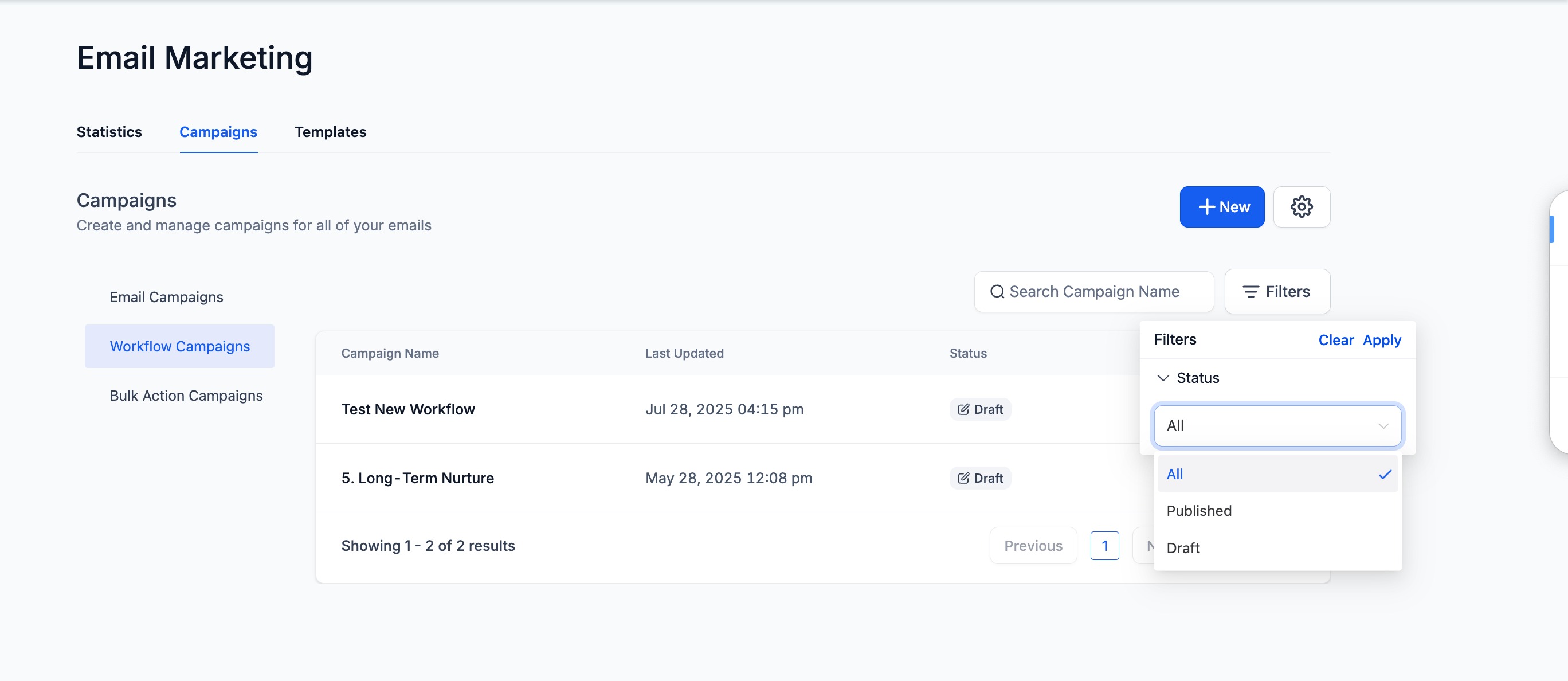 | All | Displays all workflow campaigns, including both draft and published ones. |