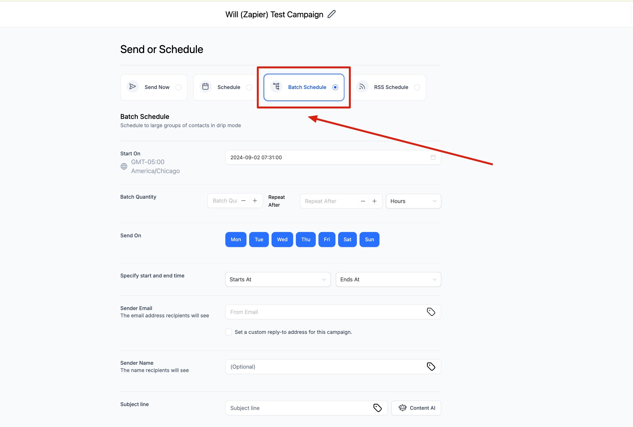 In the "Sending Options" located on the left of the image above, select "Batch Schedule" (red square) and complete the steps below: