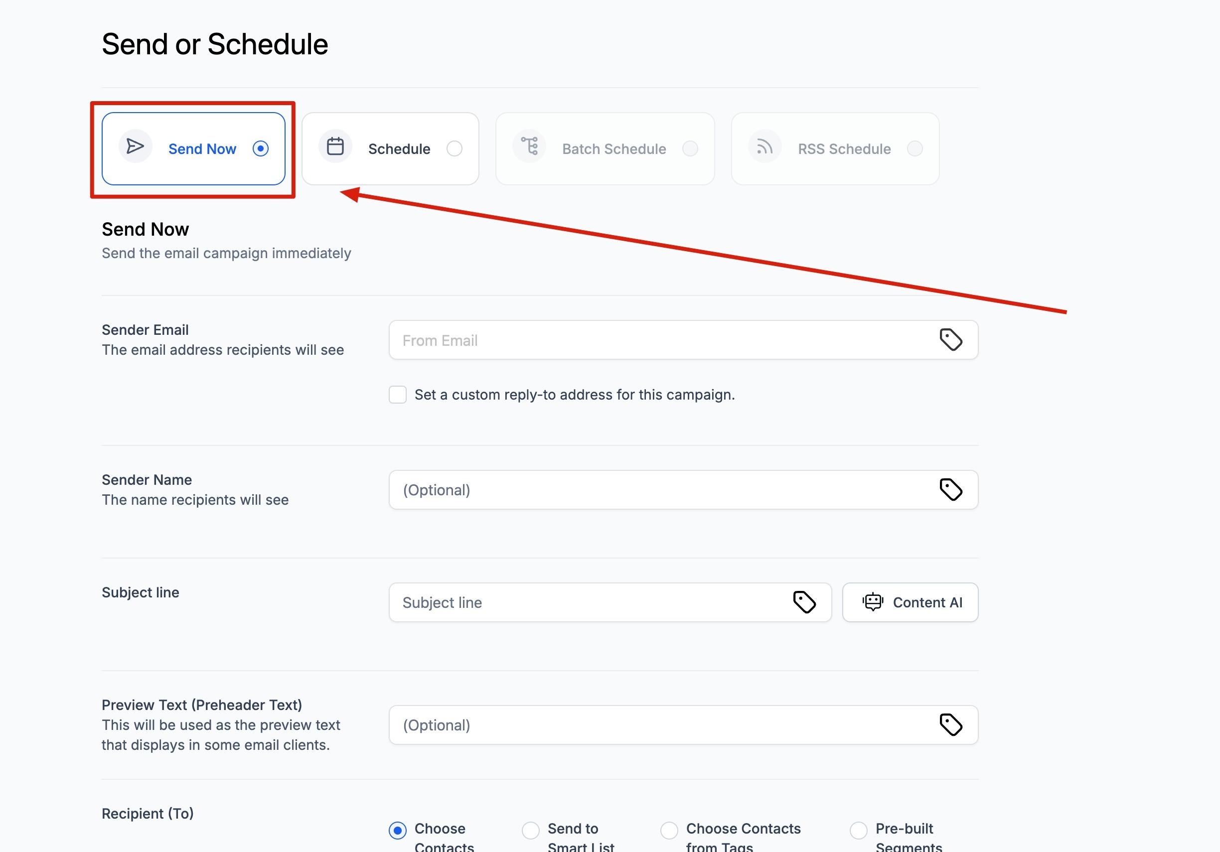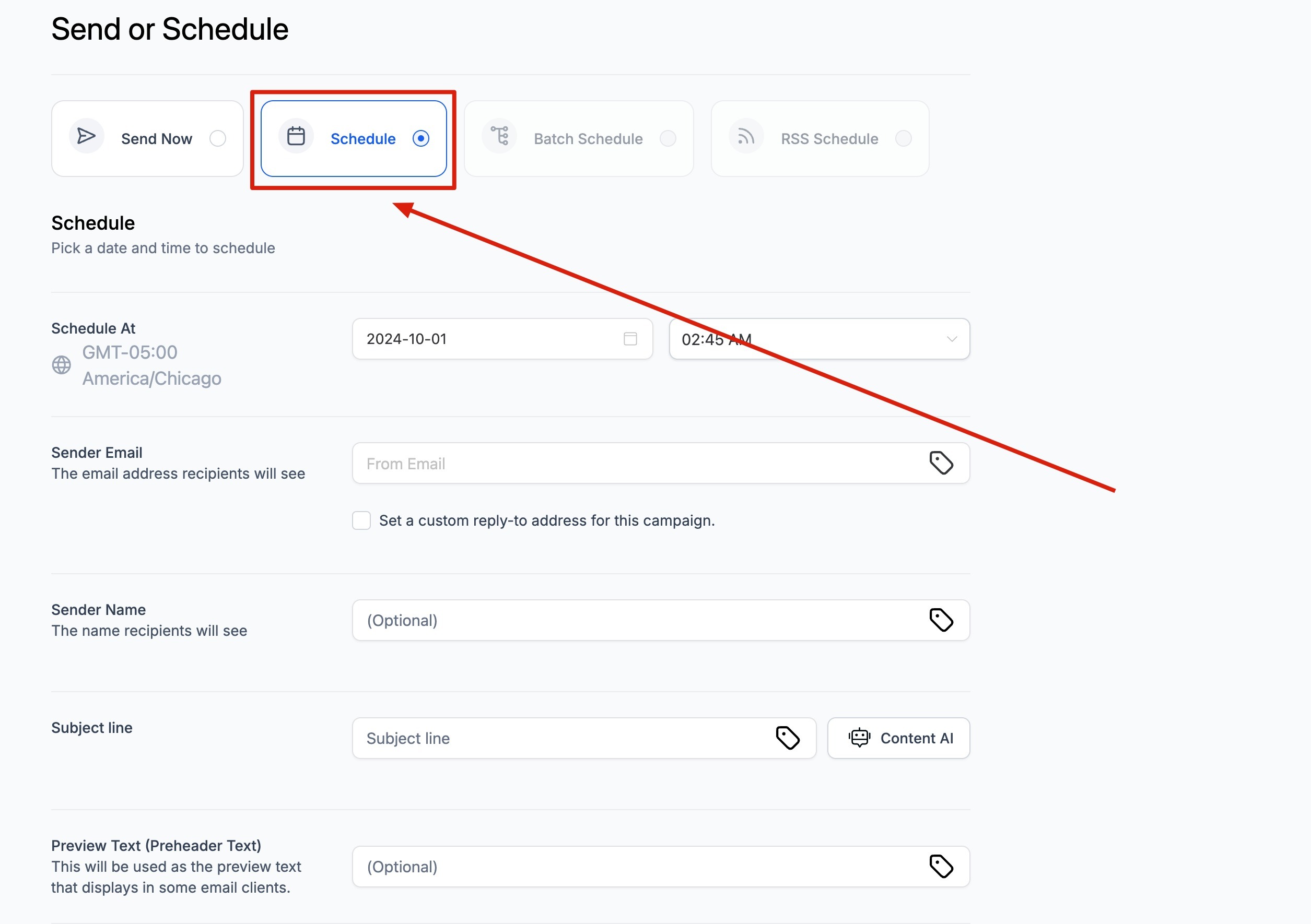 The Schedule option lets you select a specific date and time for delivery. This ensures your campaign reaches your audience when they are most likely to engage.