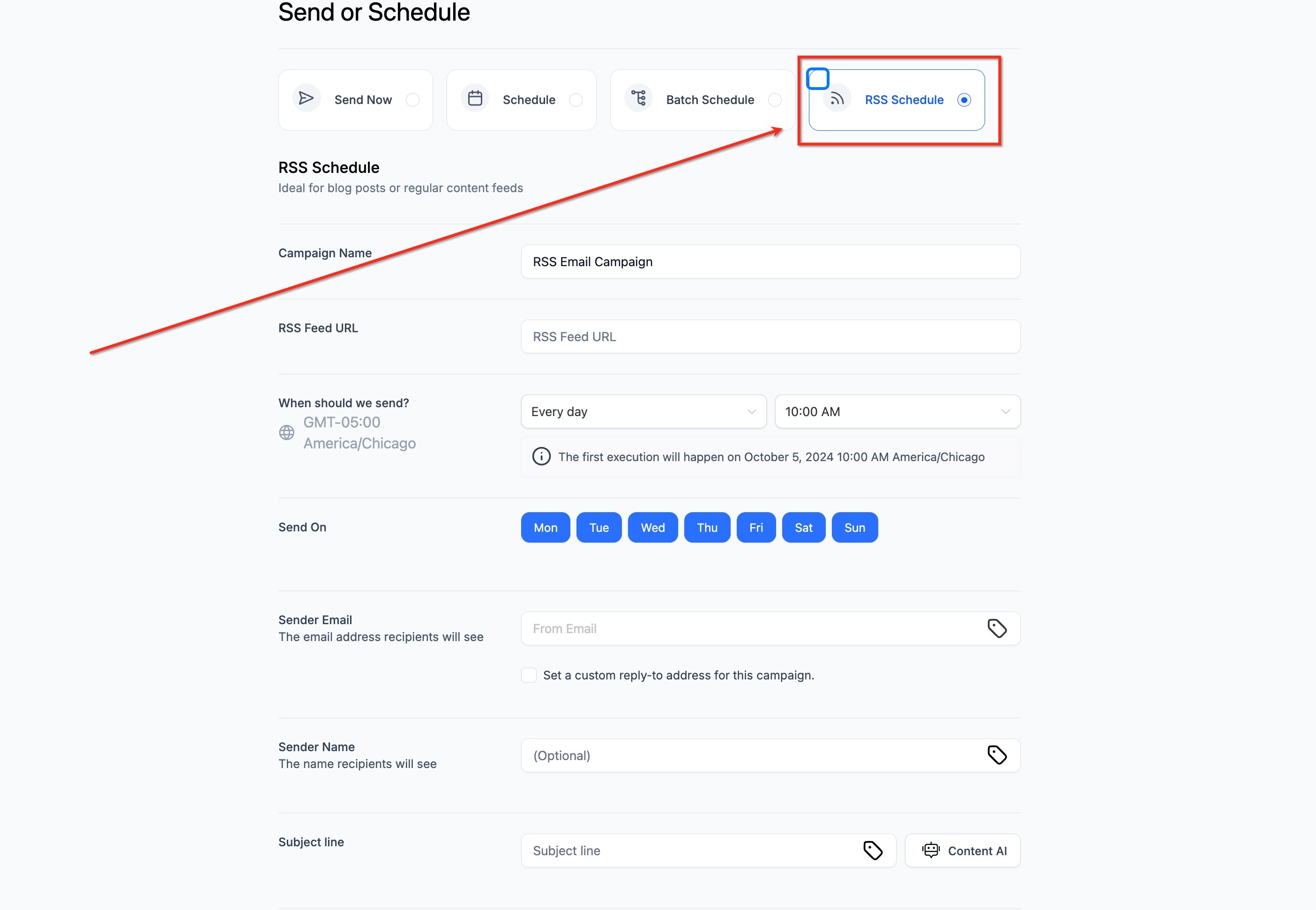 The RSS Schedule option is designed for automated campaigns linked to an RSS feed. Each time the feed updates, an email is generated and sent according to your schedule.
