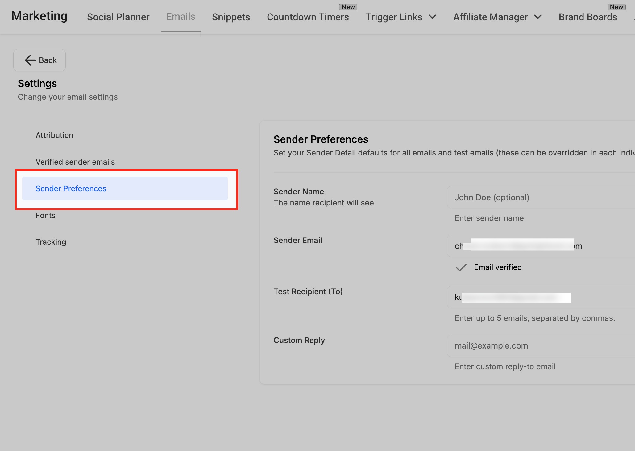 From the Settings menu, select Sender Preferences in the left sidebar. This will open the form where you can configure and manage your default sender details for all email campaigns and test emails.