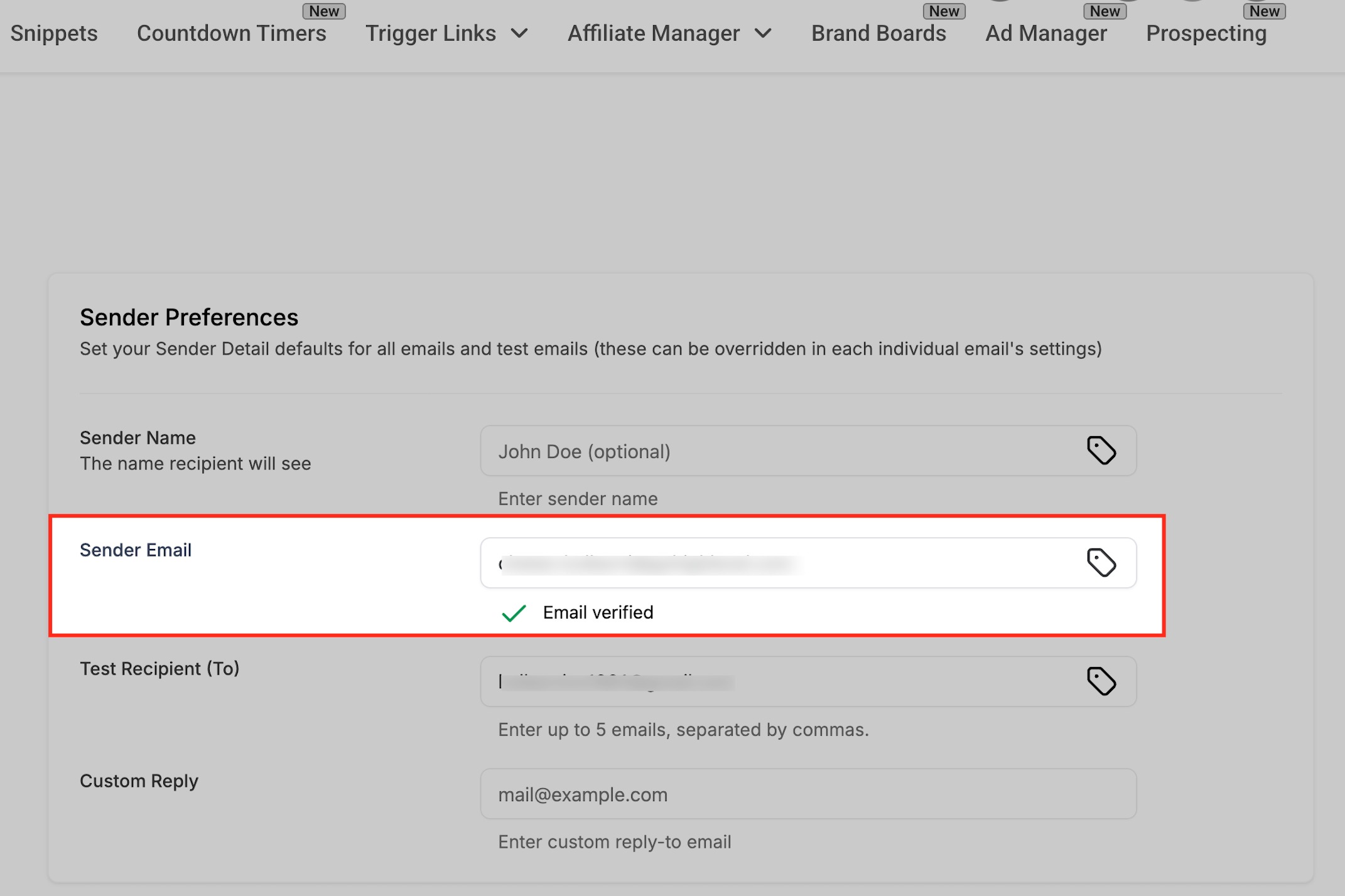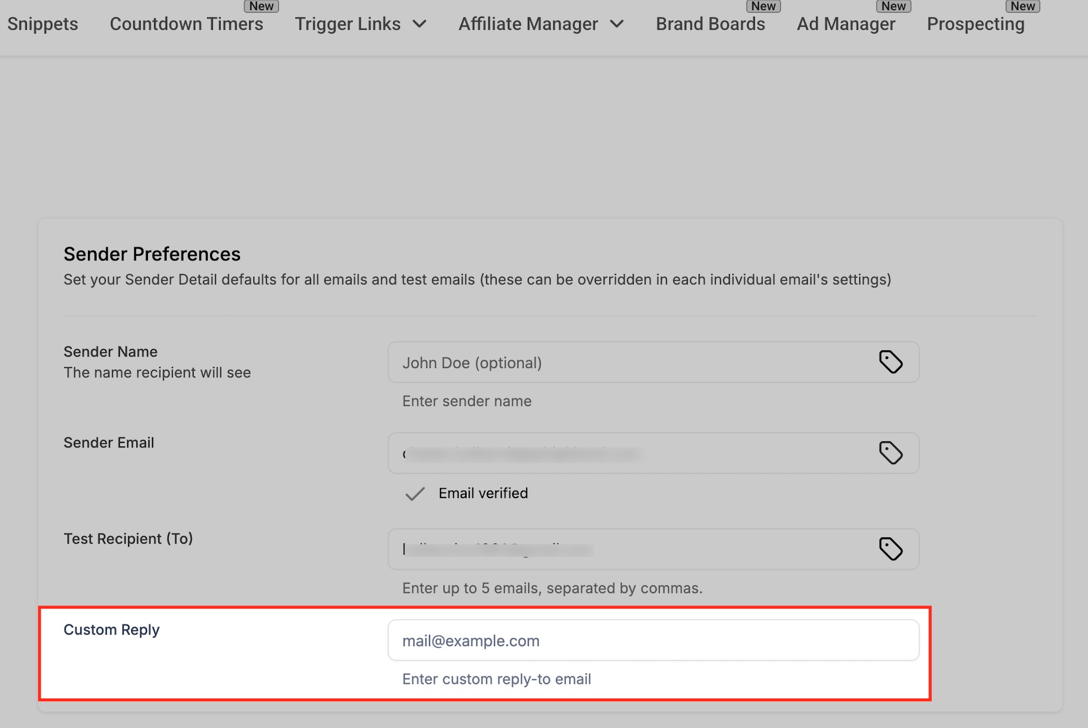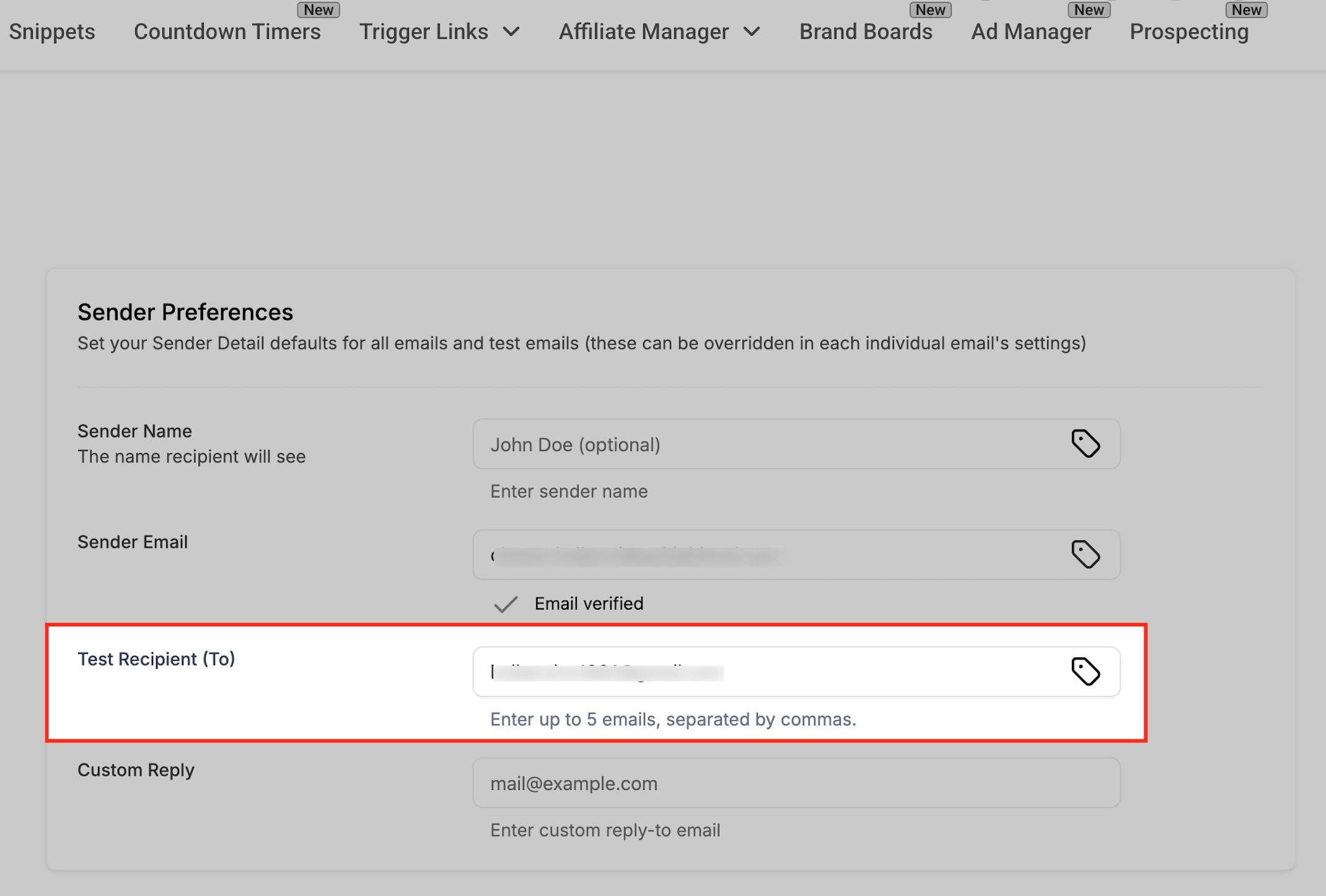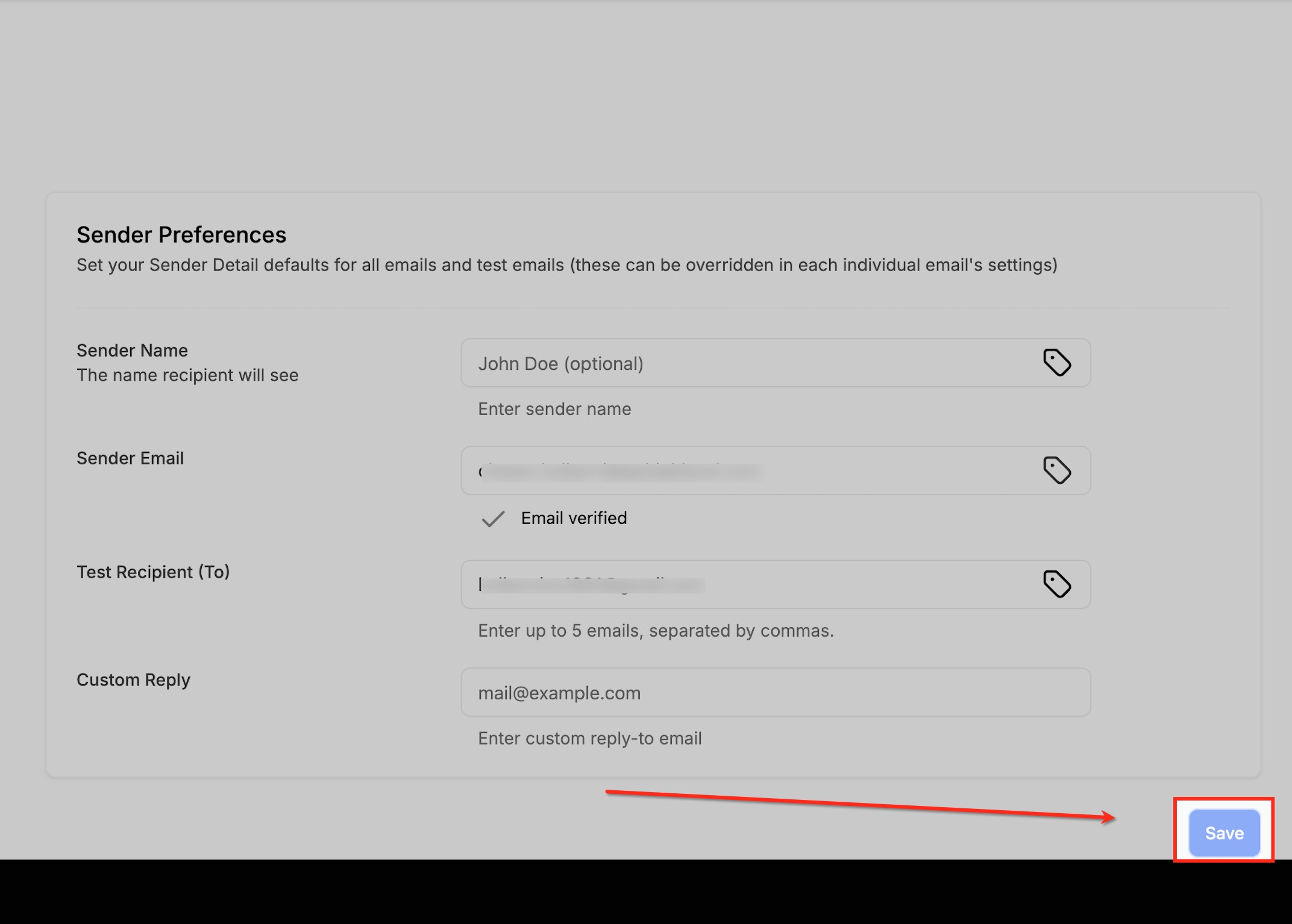 Once you’ve entered all your Sender Preferences — including Sender Name, Sender Email, Test Recipient(s), and Custom Reply — click the Save button to apply your settings. Saving ensures these values are stored as your default configuration for new campaigns and test sends.