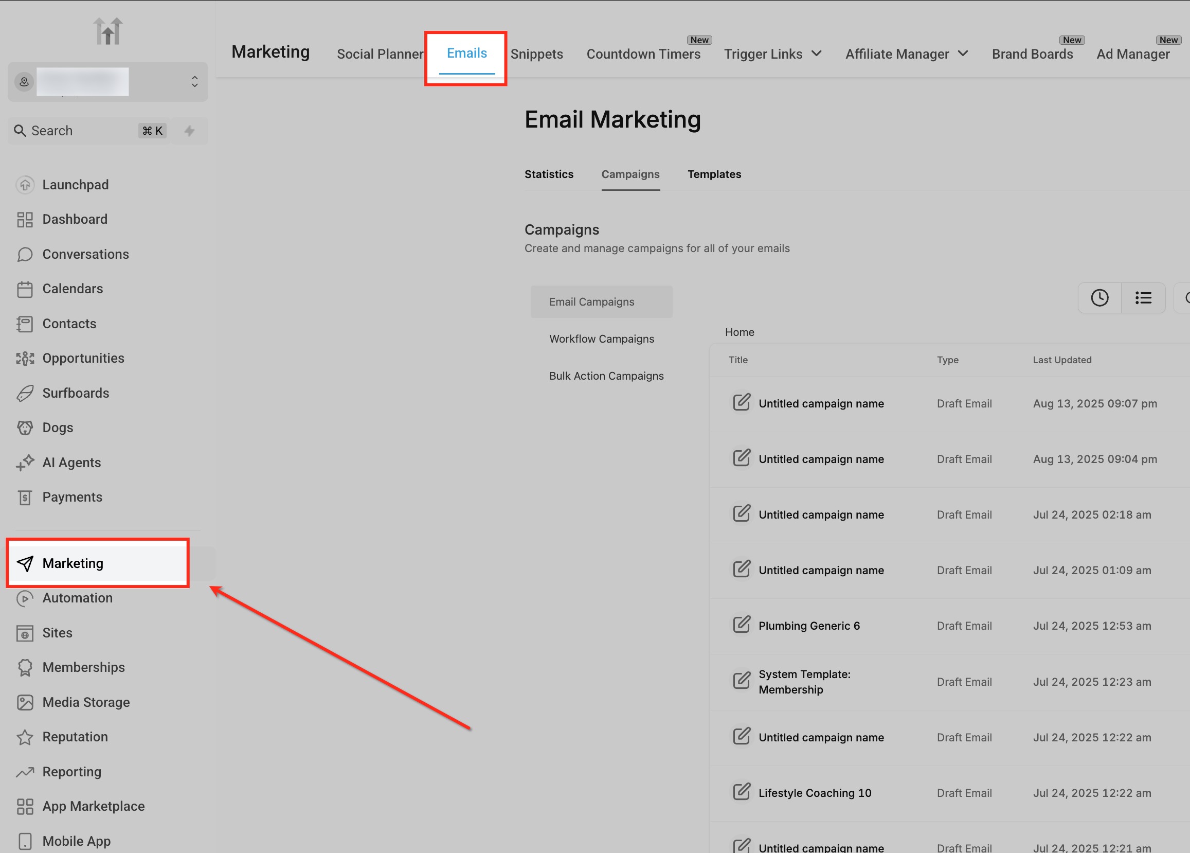 From your dashboard, click Marketing in the left-hand menu, then select Emails at the top. This takes you into the Email Builder where campaigns are created and managed.