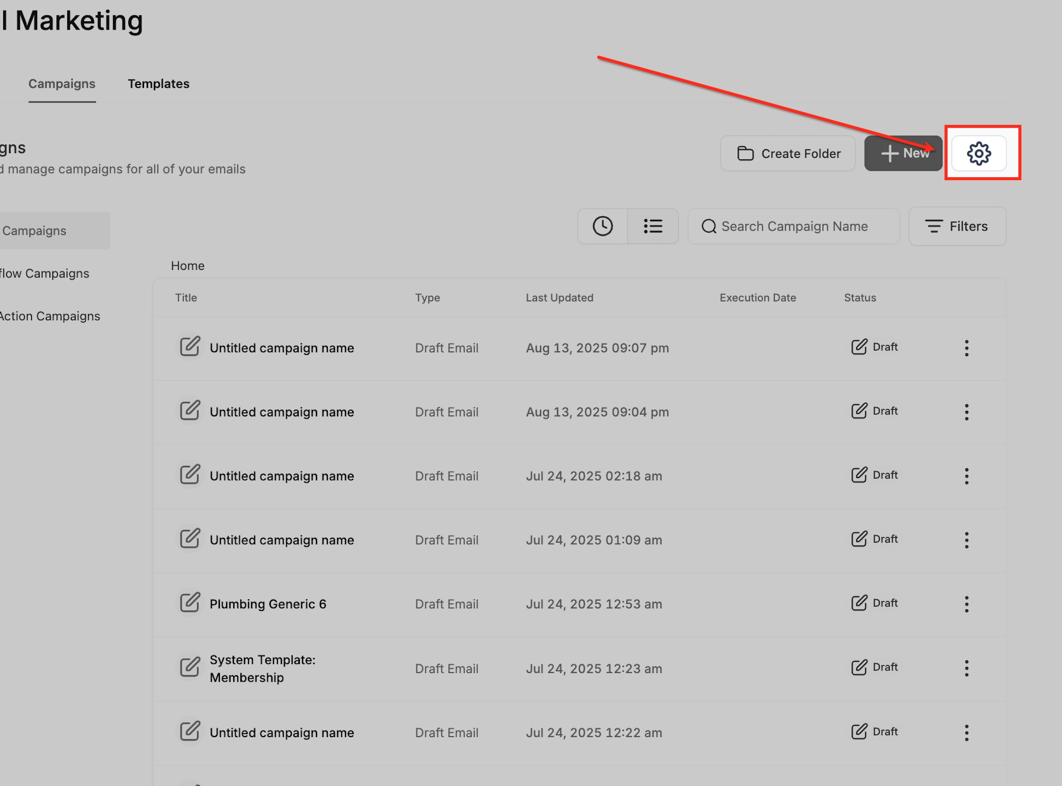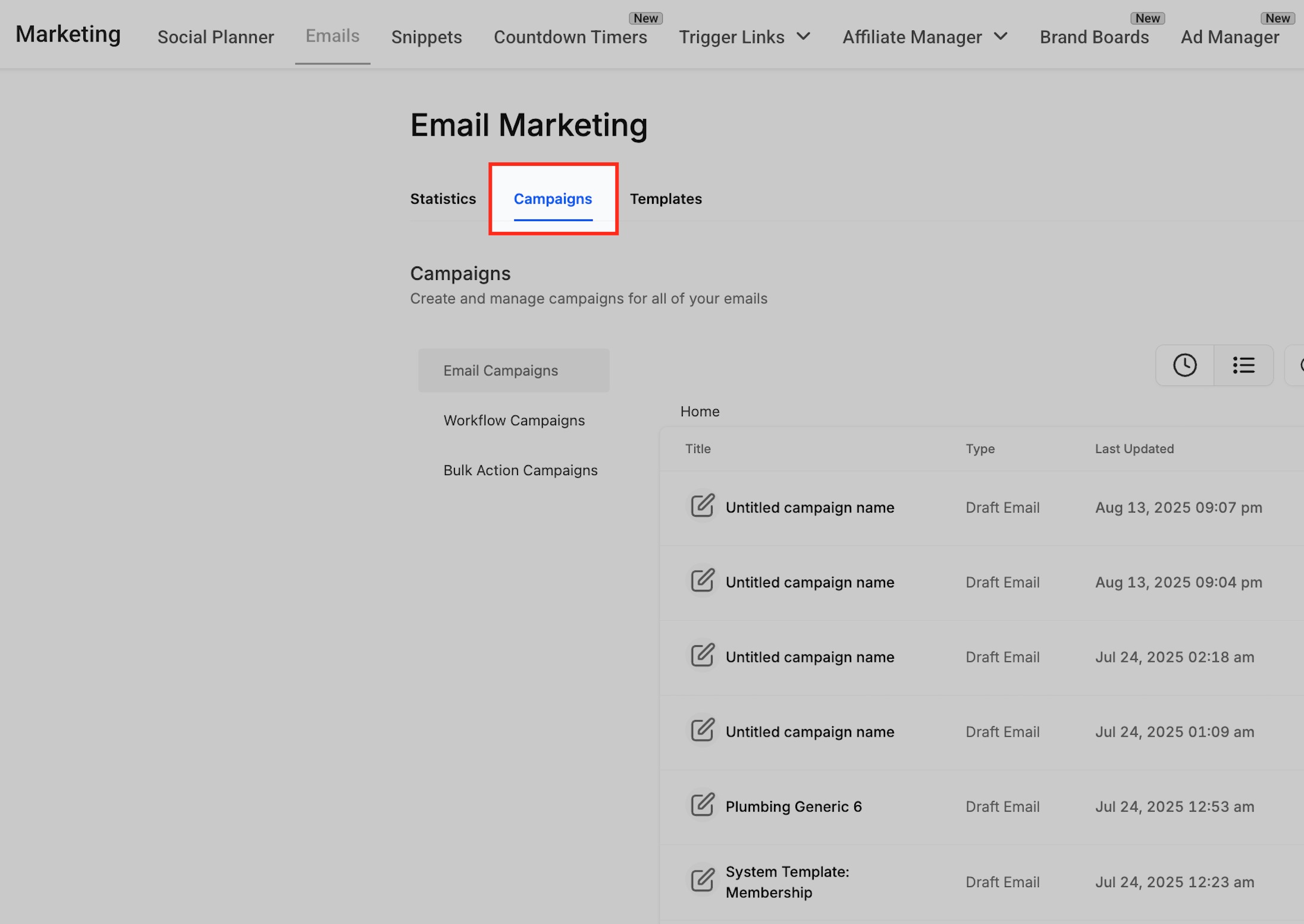 Inside Email Marketing, click the Campaigns tab at the top. This section lists all active and draft campaigns and is where you’ll manage email settings.