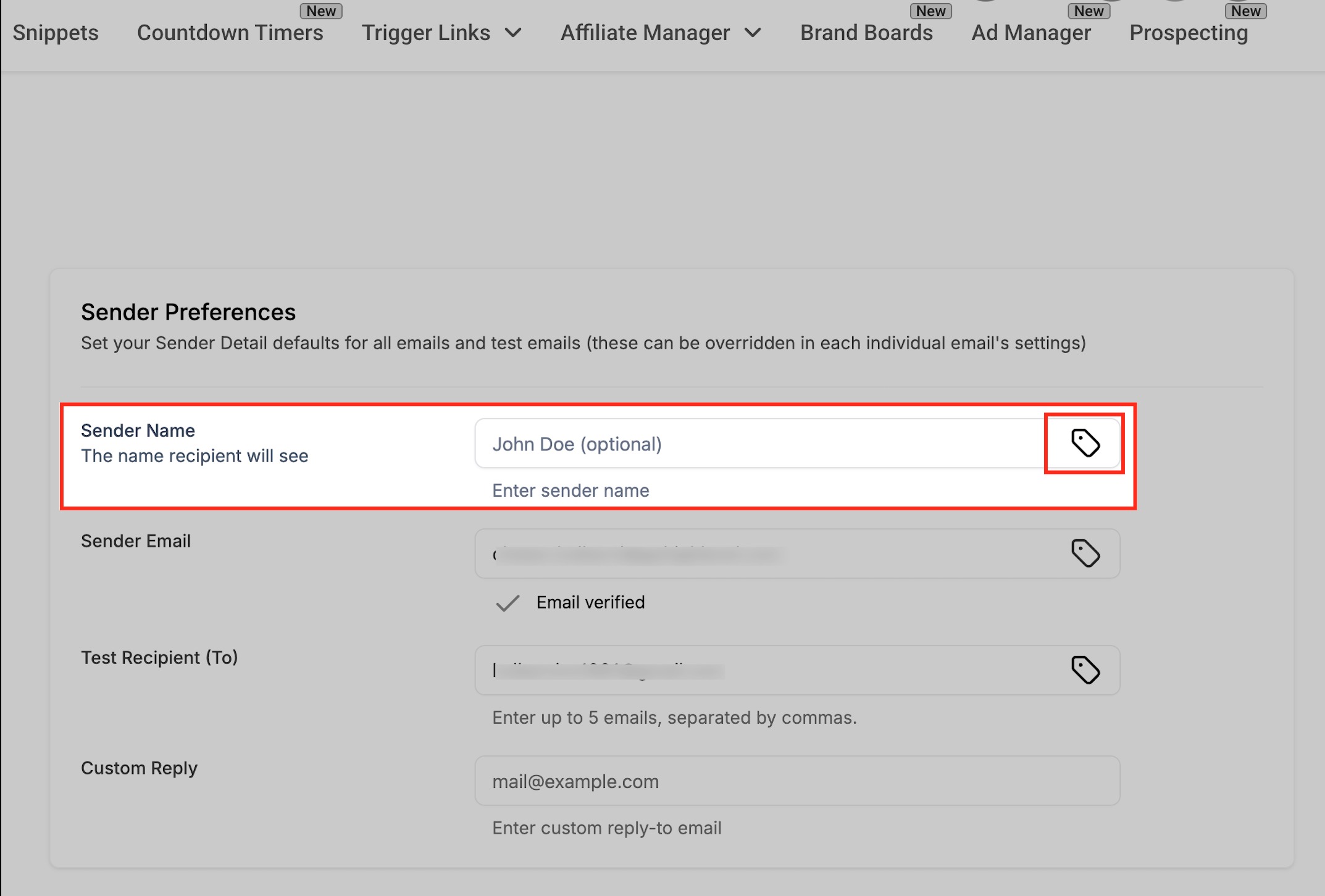 On the right, the tag icon allows you to insert a dynamic value, such as a custom field, instead of typing a static name. This is useful if you want the sender name to adapt automatically based on the campaign or account settings.