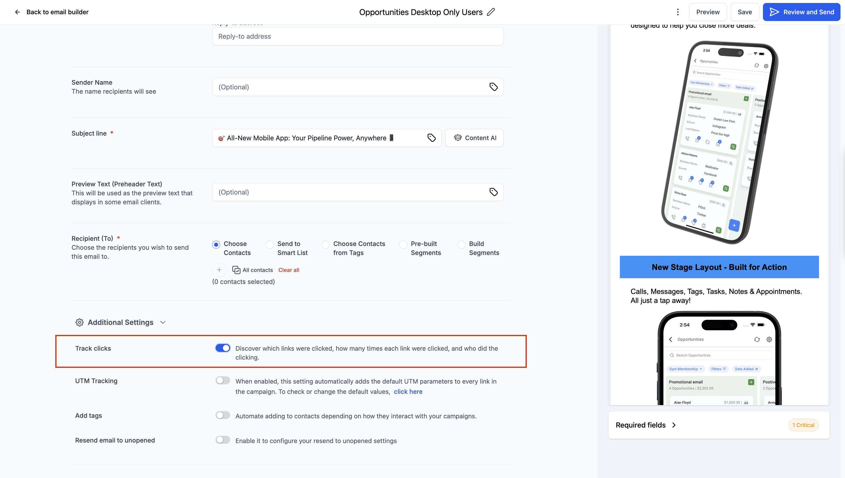 Tip: If you forget to turn on “Track Clicks” before sending, click data will not be collected for that campaign. Always enable it before scheduling or sending.