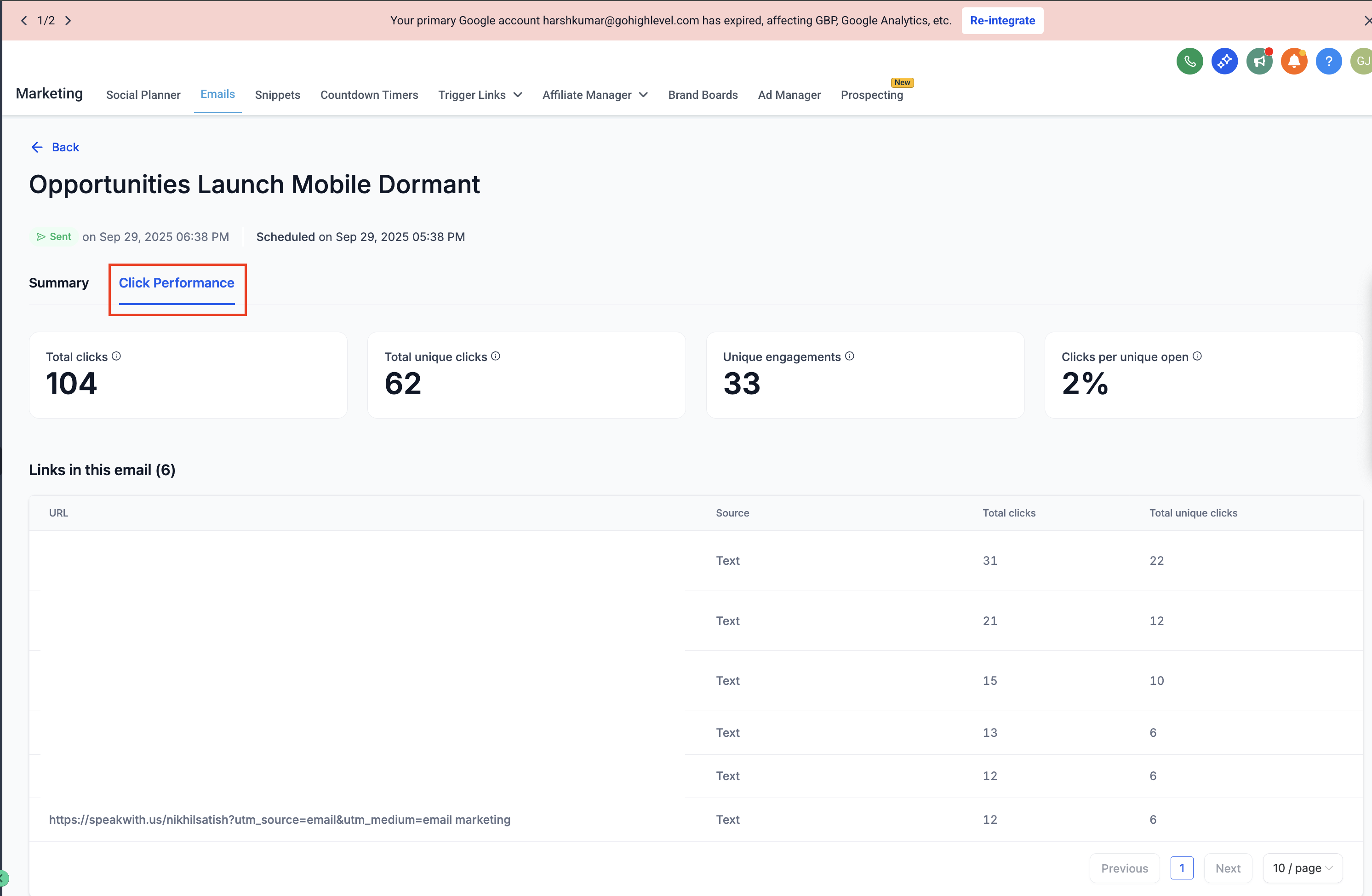 The Click Performance report gives you a breakdown of all link interactions within a sent email. Each link’s performance is tracked individually so you can measure engagement, identify which URLs drive the most clicks, and optimize your future campaigns for better results.