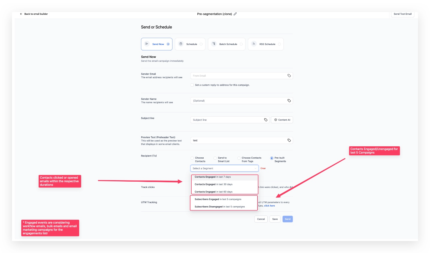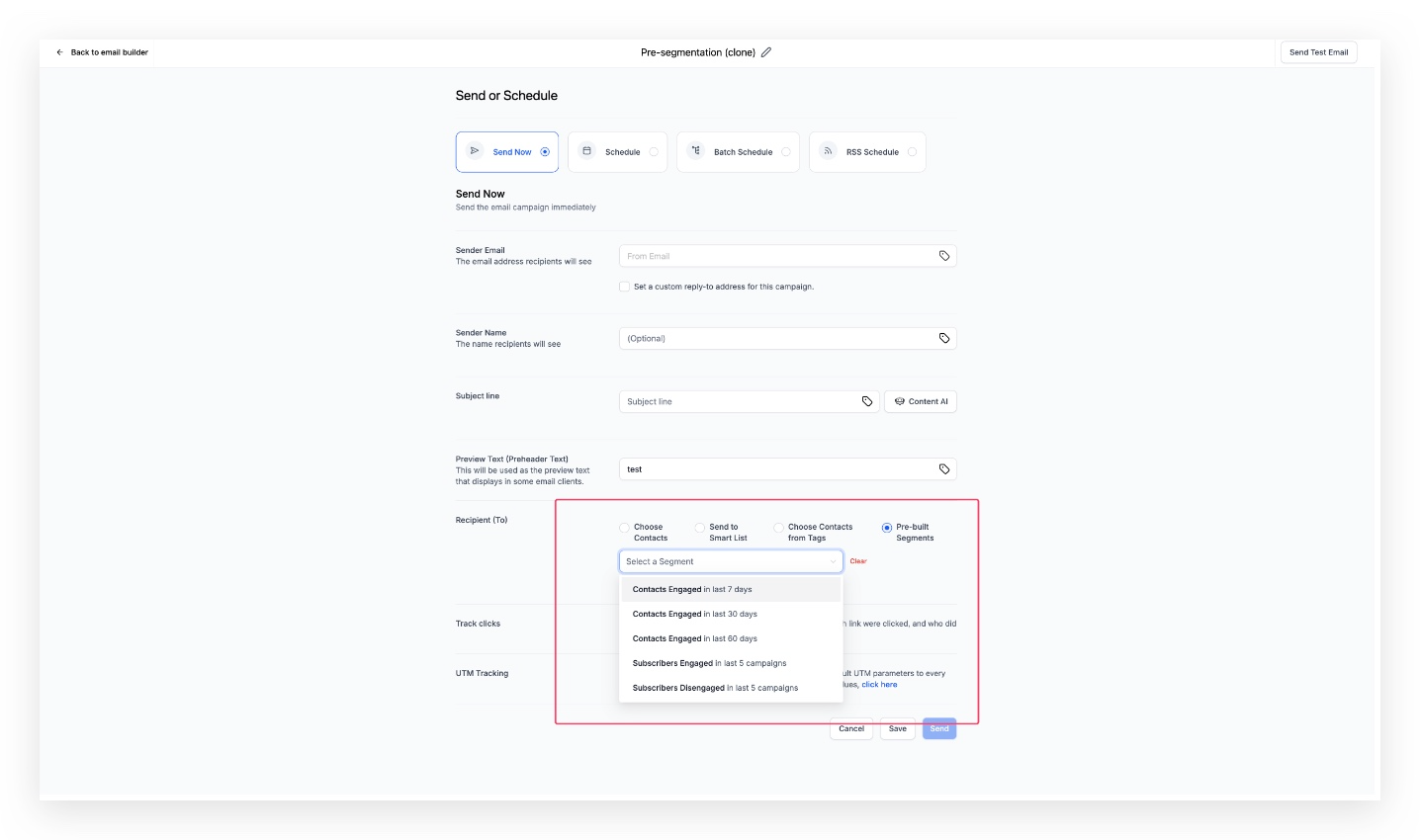 You can now select from several pre-built contact segments directly from the send or schedule screen. These segments include: