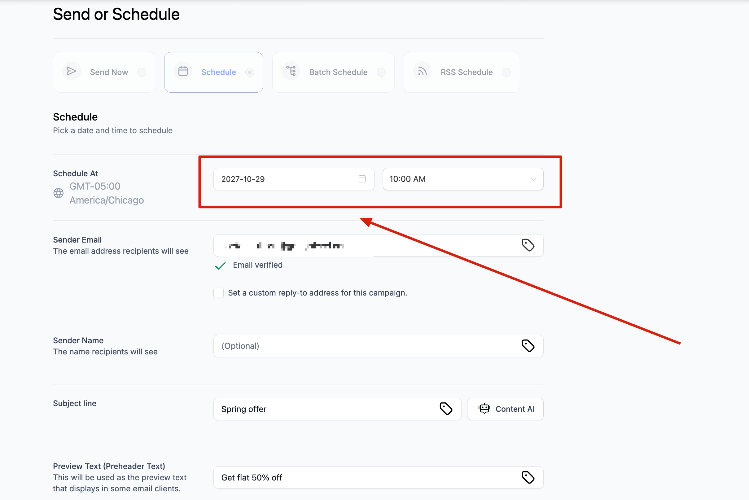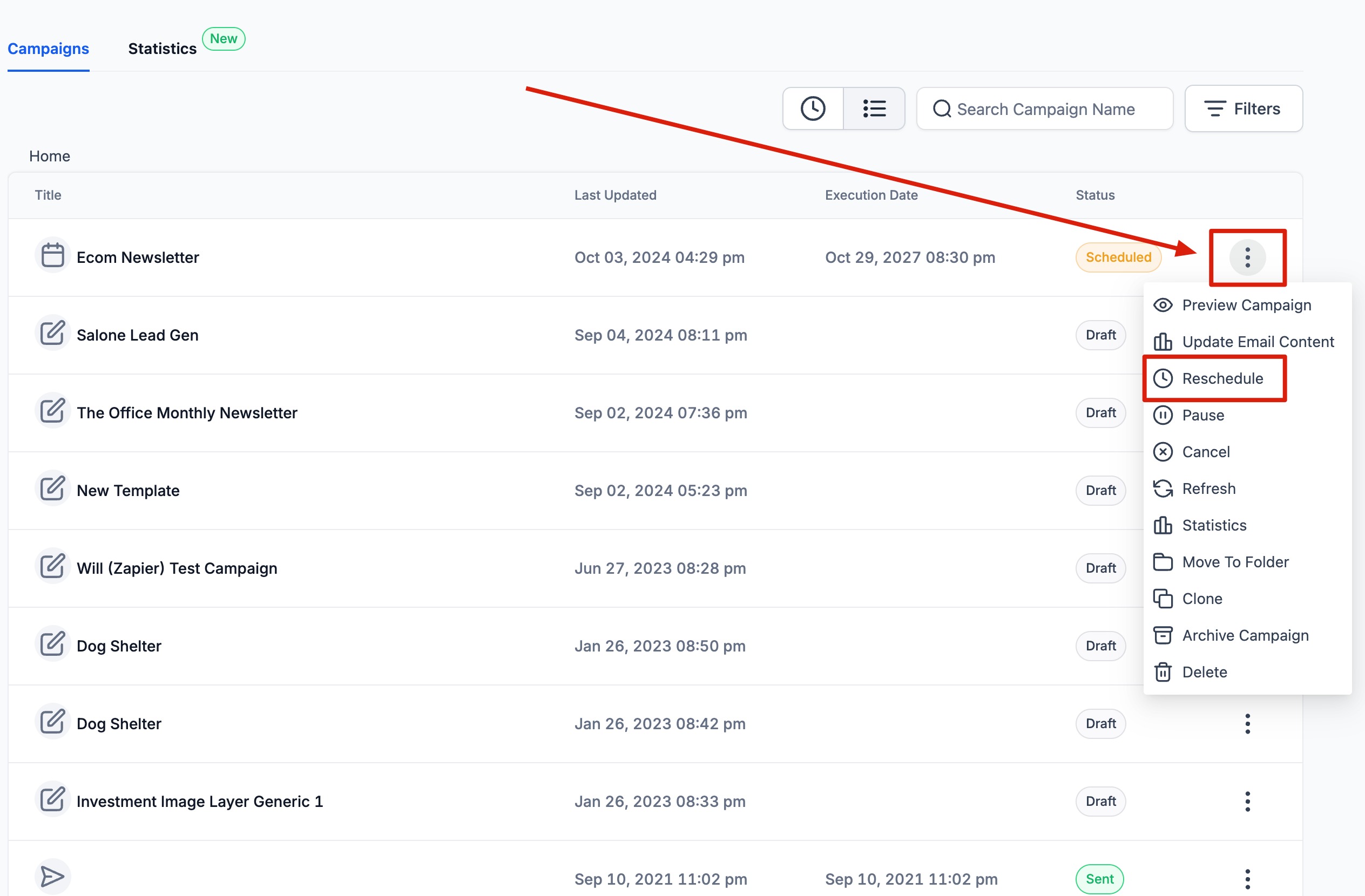 Rescheduling of Email Campaign is possible for Simple Schedule, Batch Schedule, and RSS Schedule one hour (60mins) ahead of the execution date.
