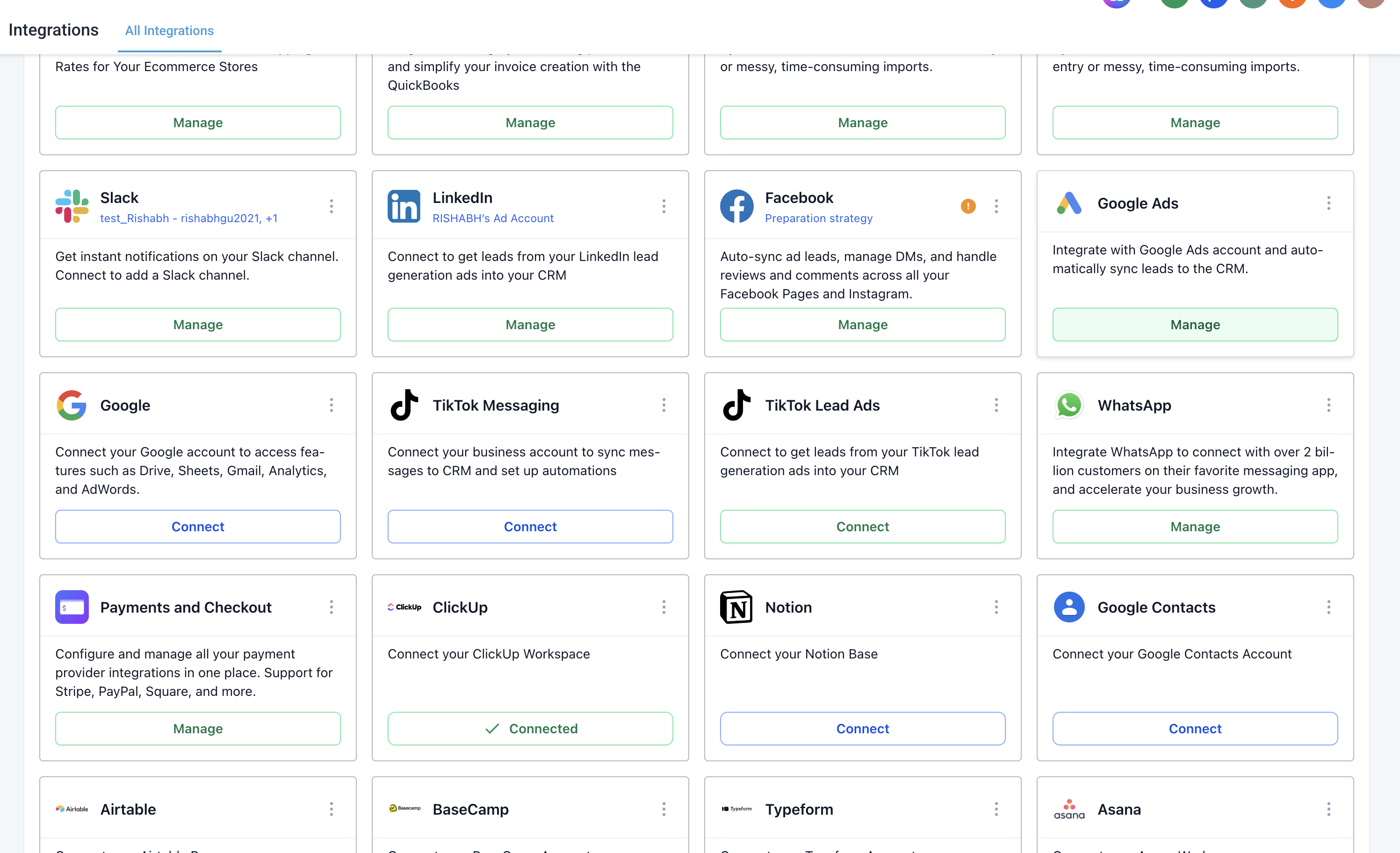 To disconnect all connected accounts at once, open the 3-dot menu on the integration card and select Disconnect.