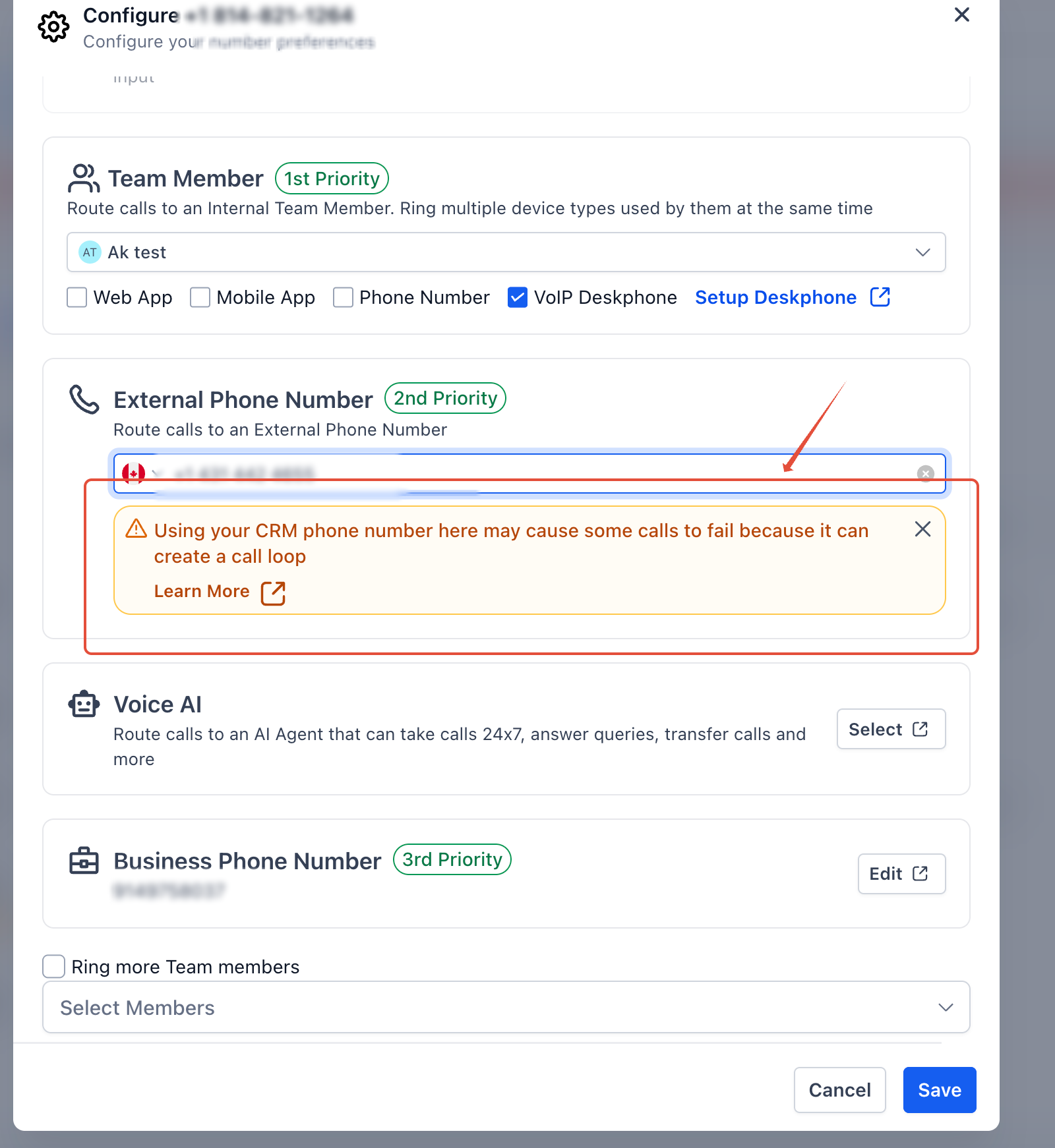 Leadconnector provides flexibility for advanced call routing setups, but using a CRM phone number as a forwarding or routing destination requires careful configuration. The warning is designed to help you avoid call loops and potential call failures while still allowing you to proceed if you understand the risks.