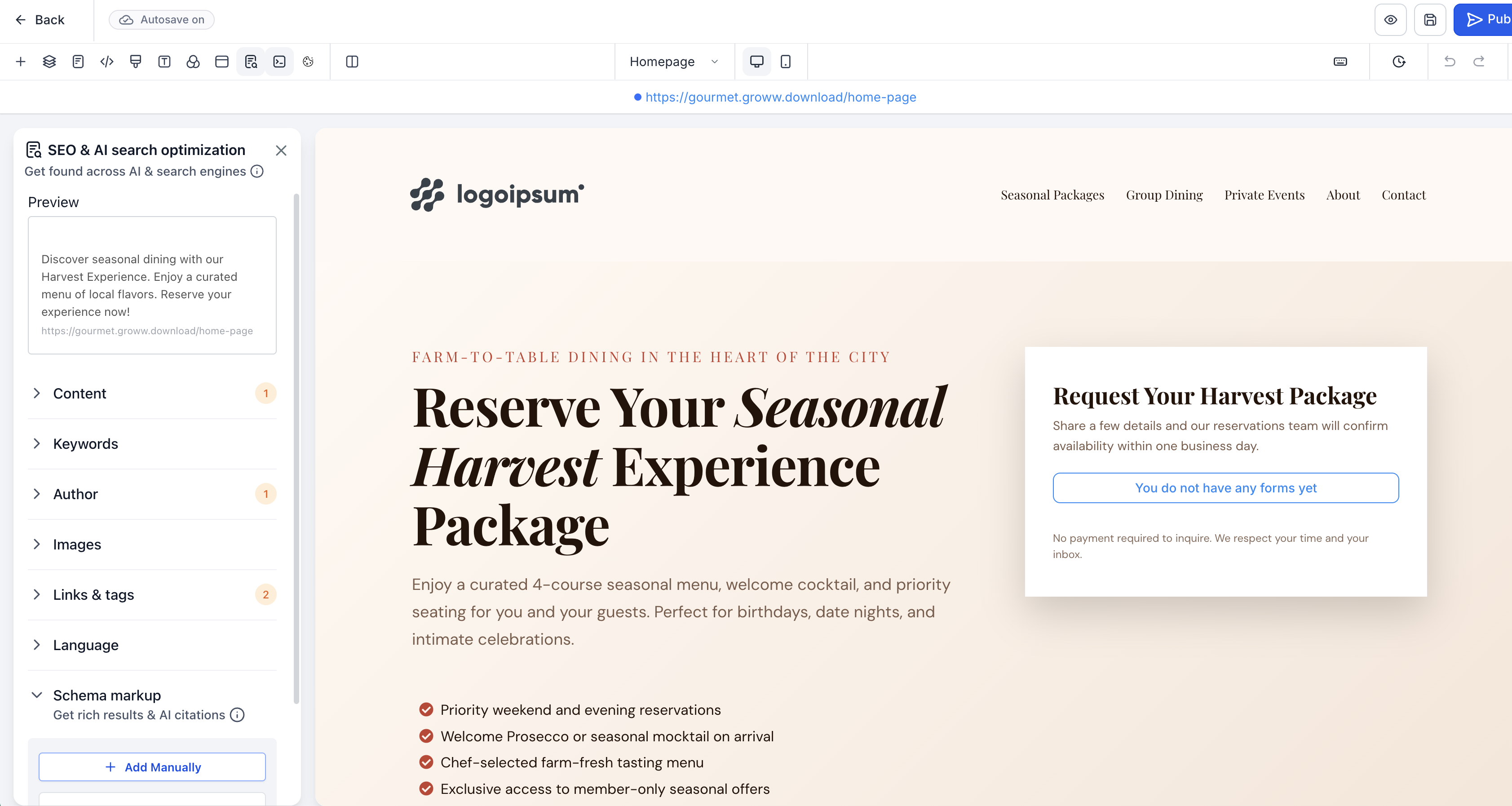 Navigate to your website builder → SEO & AEO Optimization → Schema Markup. The tool appears in the same section where you edit page titles and meta descriptions.