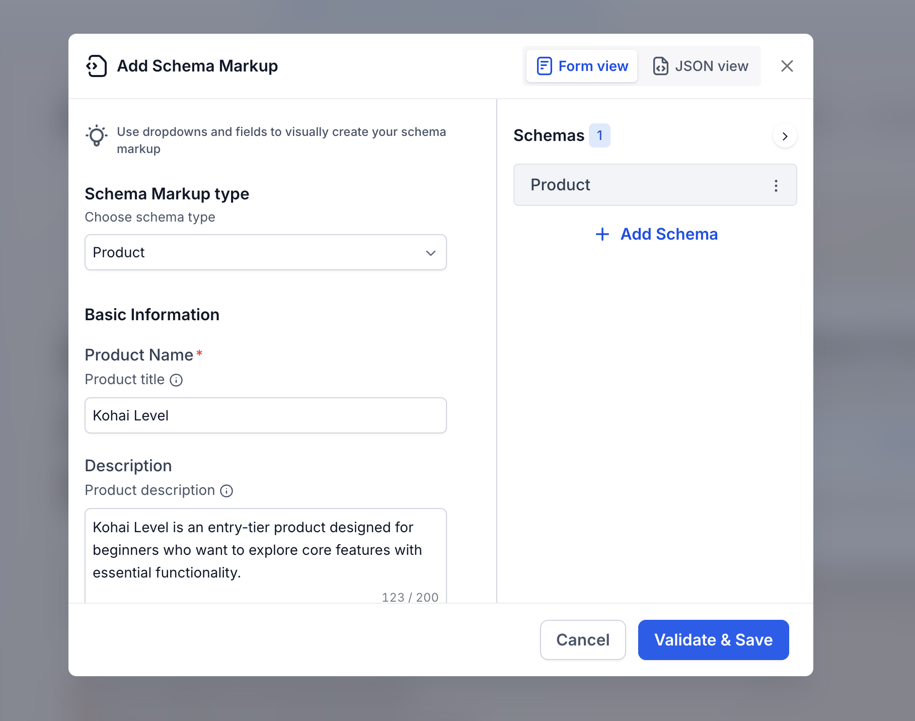 JSON View (Advanced): For tech-savvy users or those importing existing code, edit the schema markup directly. Includes syntax highlighting and real-time validation.
