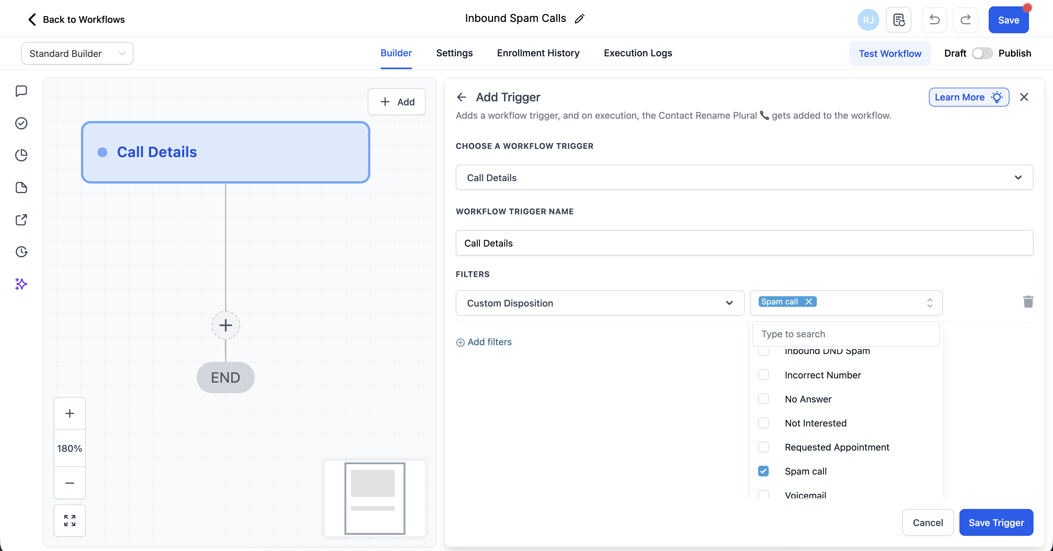 2B: Trigger a workflow when “Spam call” is selected
