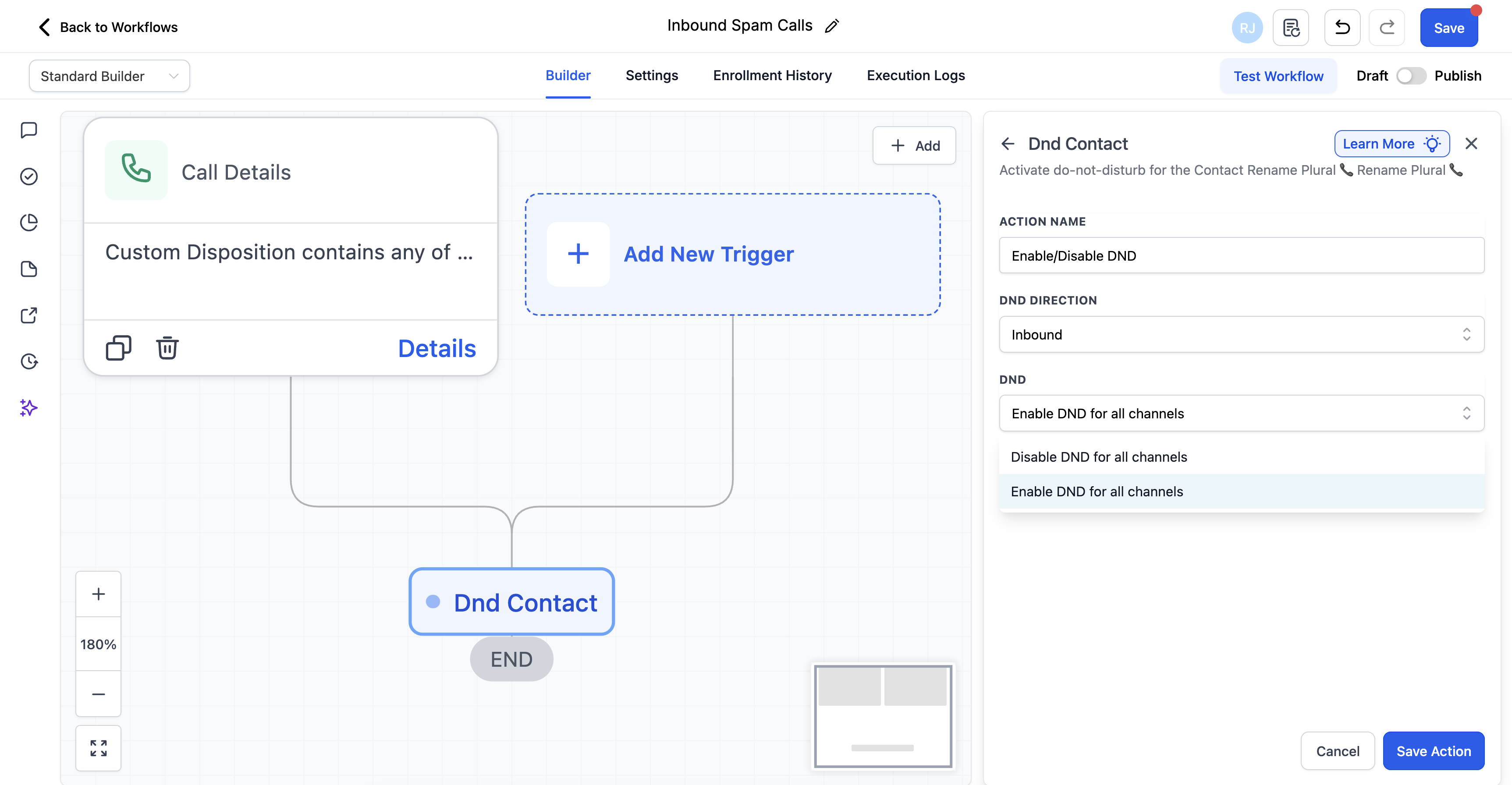 Action: Enable/Disable DND. Choose DND Direction as "Inbound" and "Enable DND for all channels"