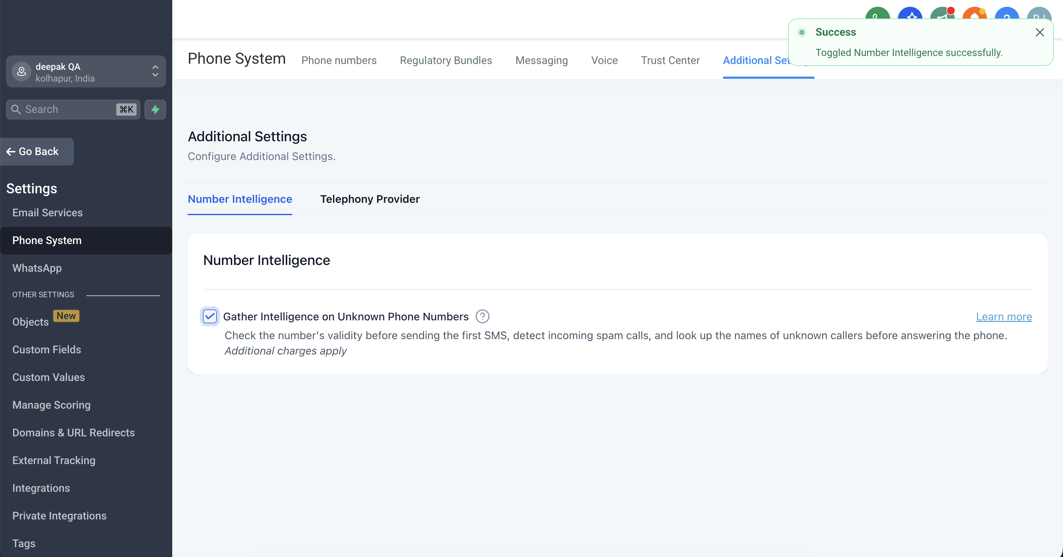 Under Sub-account Settings > Phone System > Additional Settings > Number Intelligence, toggle it on.