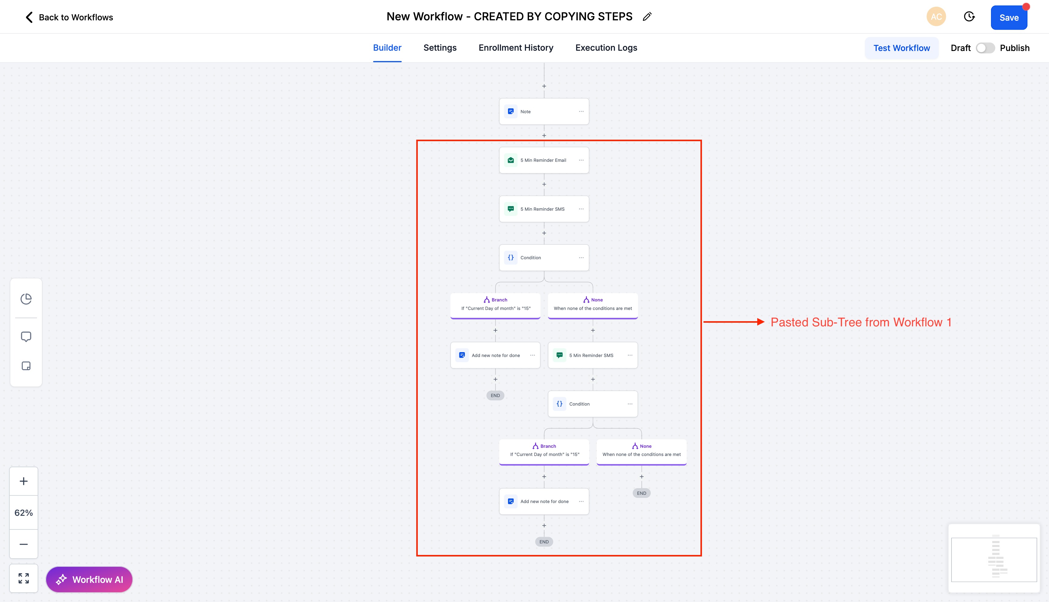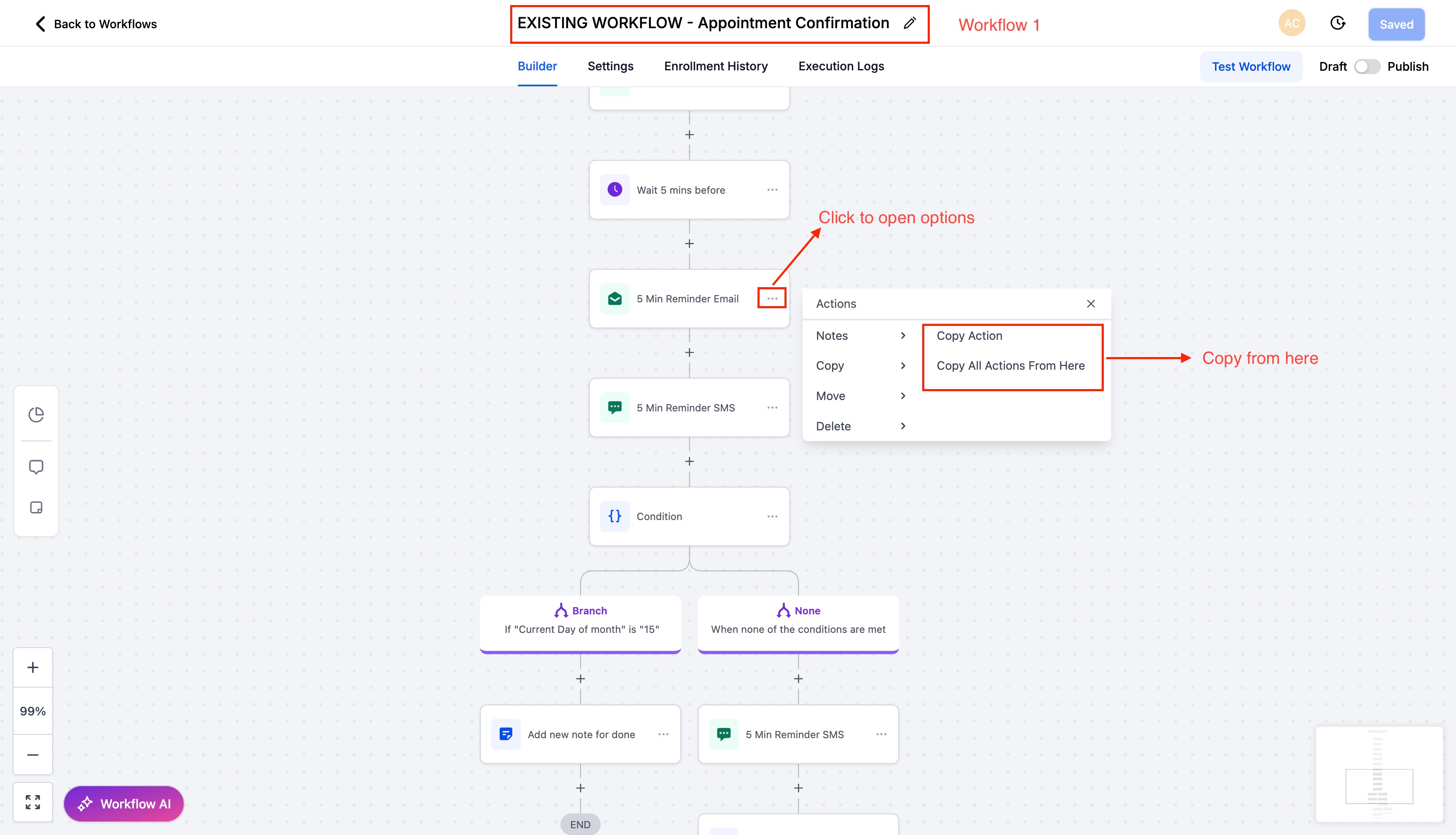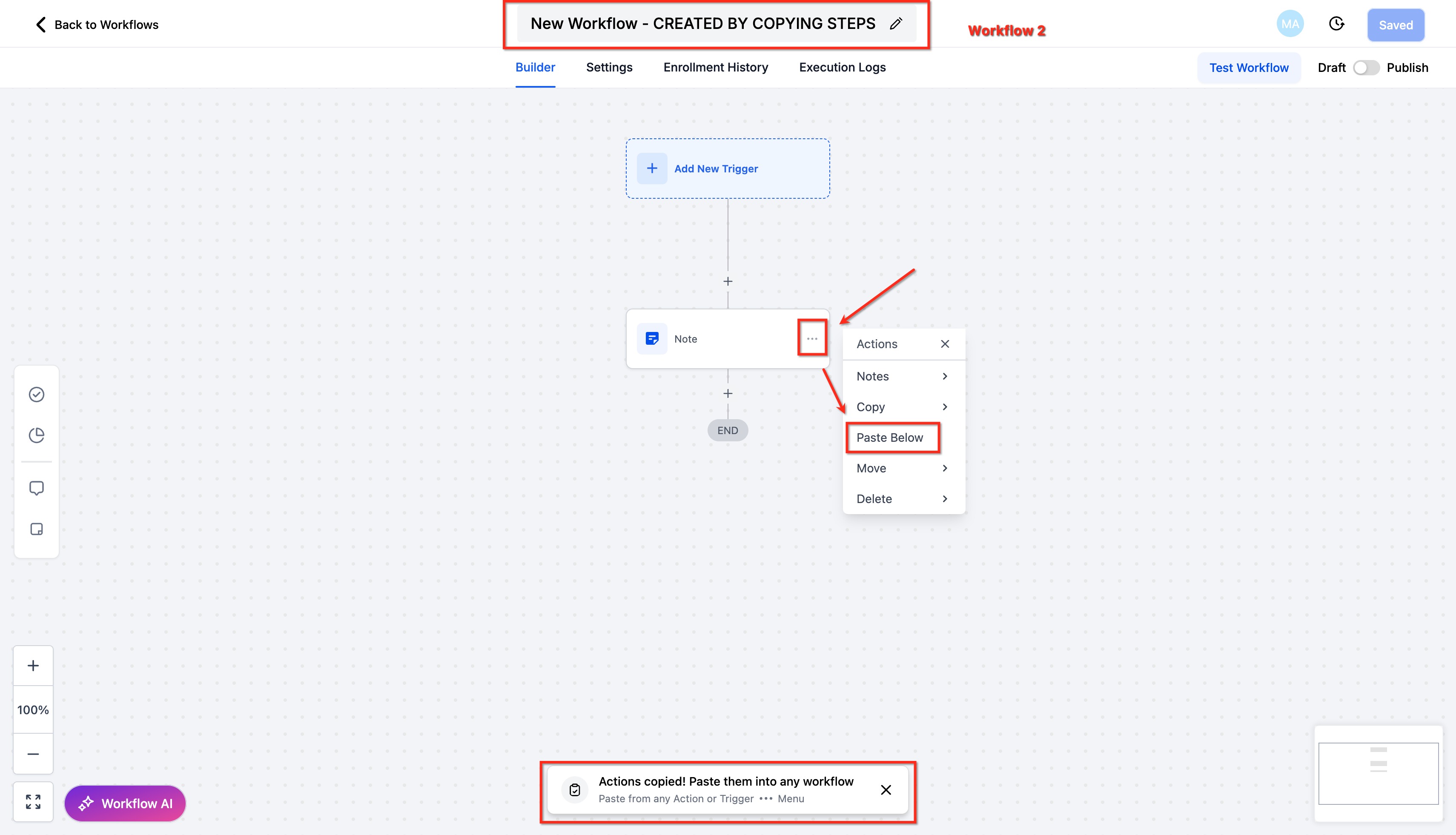 Copying actions between workflows allows you to duplicate existing steps—either a single action or a sequence—and paste them into another workflow within the same account. This accelerates workflow creation, reduces repetitive configuration, and helps maintain consistent automation standards across projects.