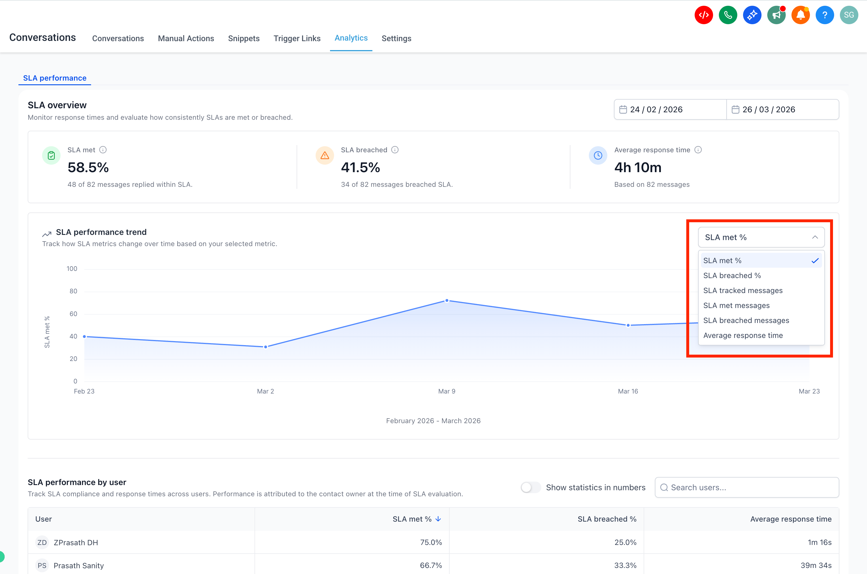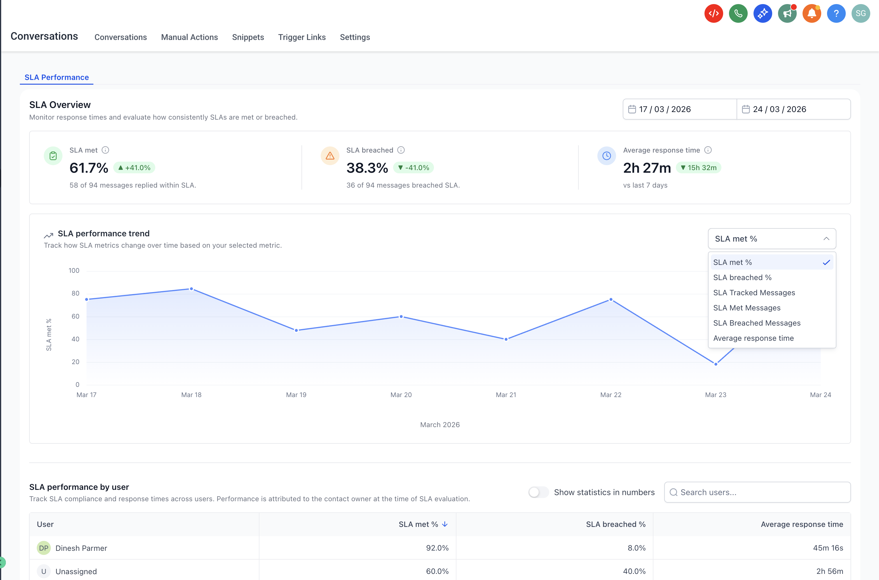 SLA Performance Dashboard provides insights into how well your team meets response time commitments (SLAs). It helps you answer key questions like: