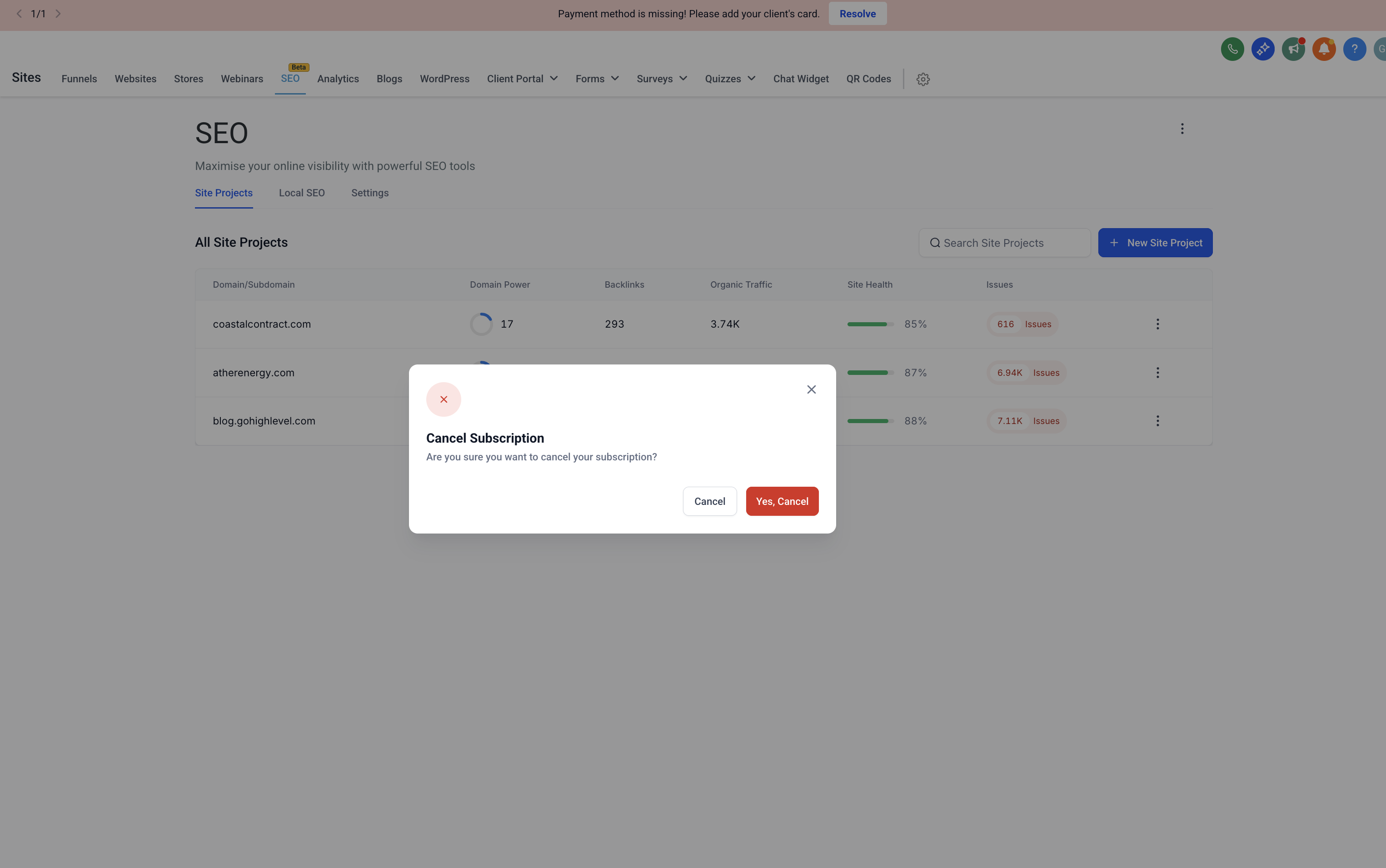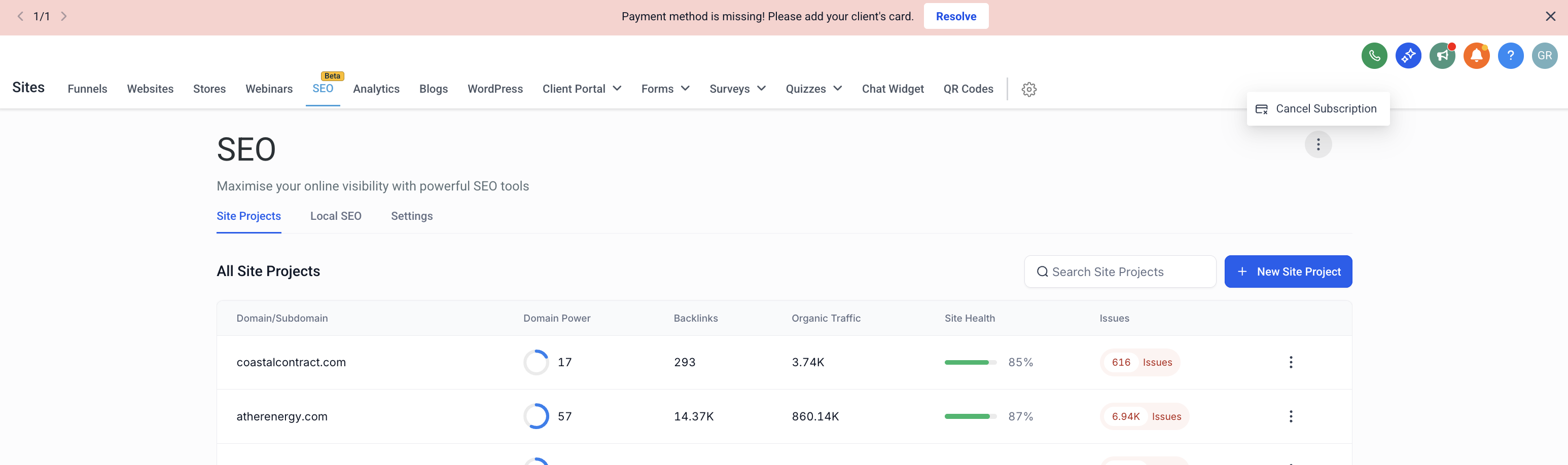 - On the Site Projects tab, click the three-dot menu in the upper-right area of the SEO page and select Cancel Subscription.