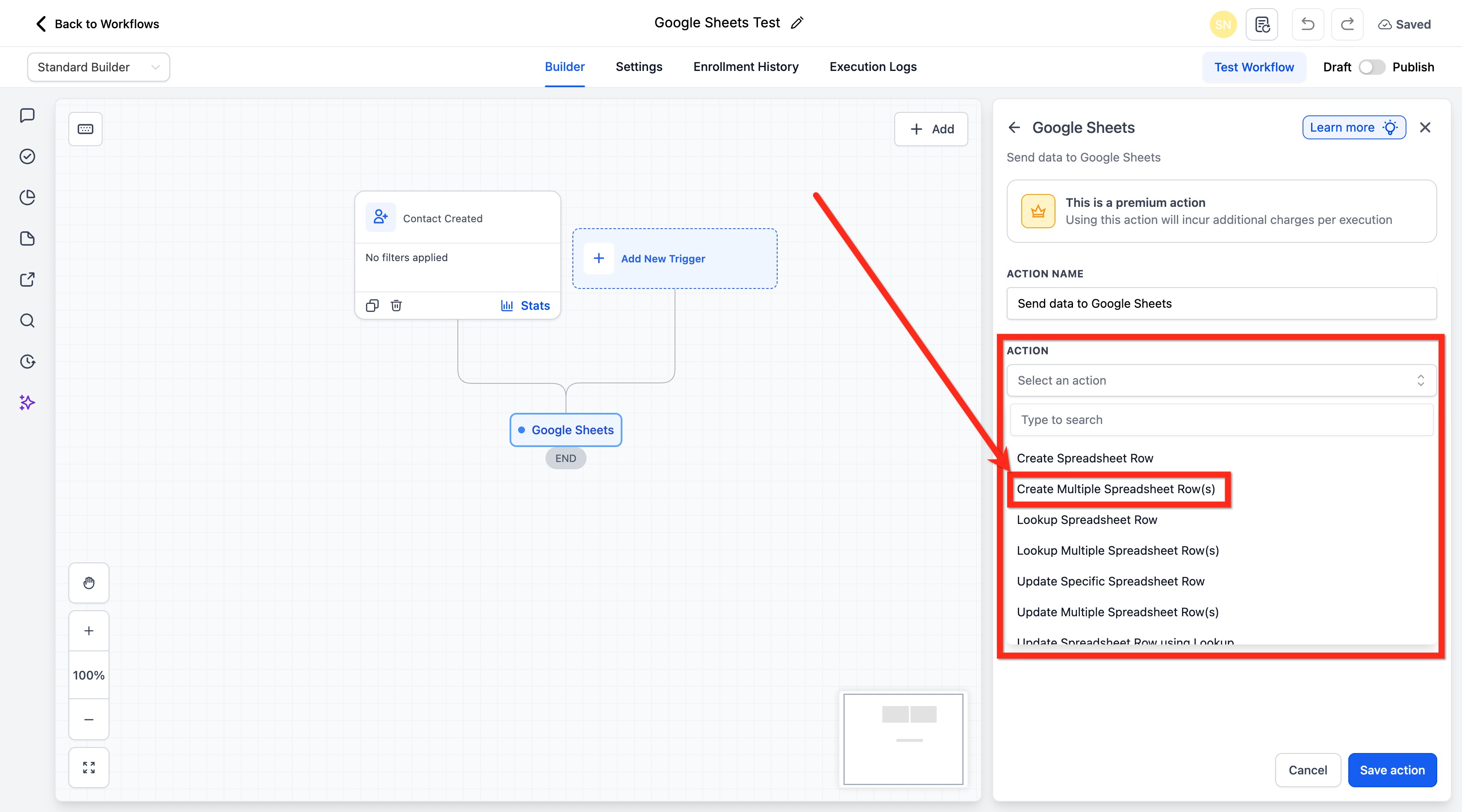 - From the Action dropdown, select Create Multiple Spreadsheet Row(s).