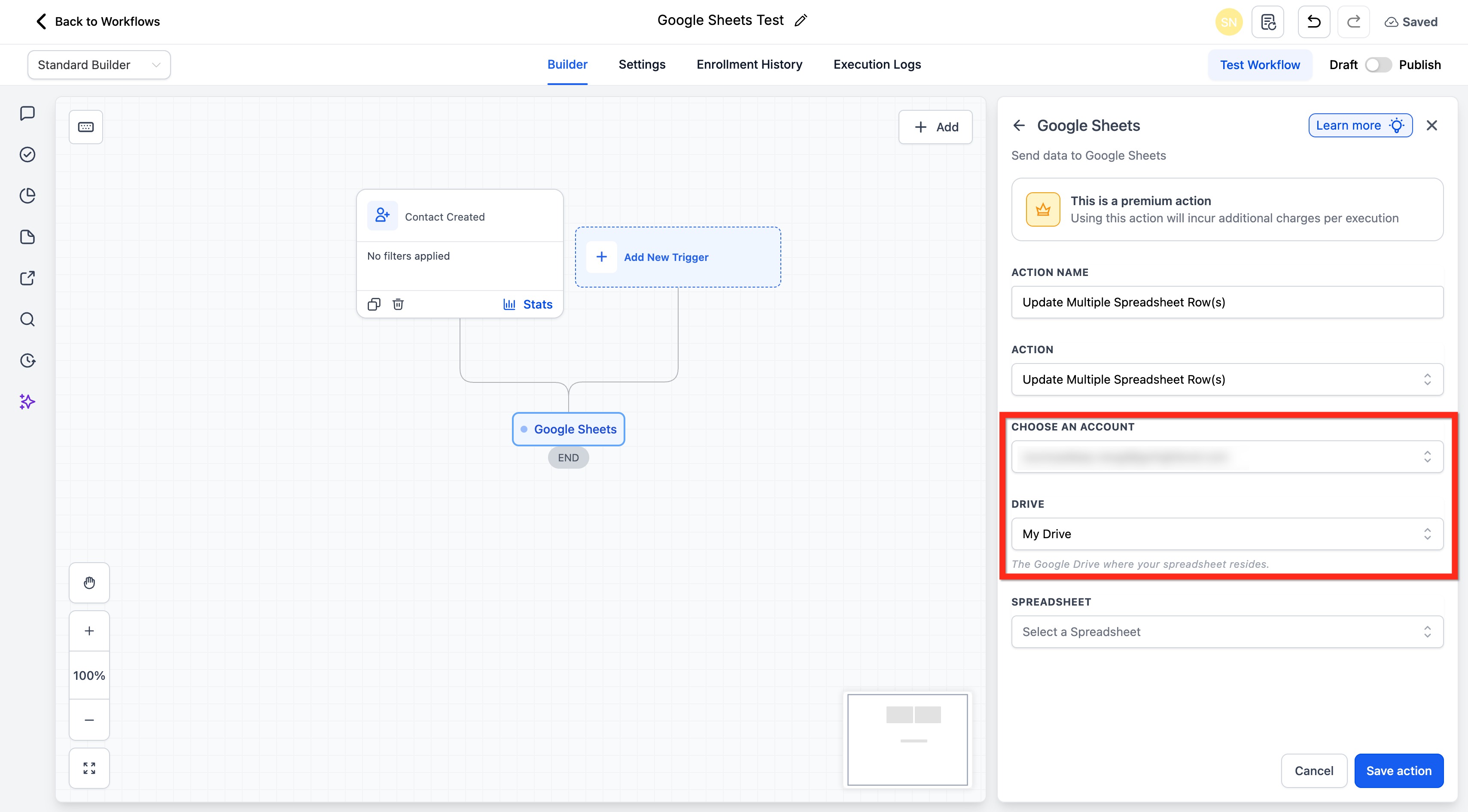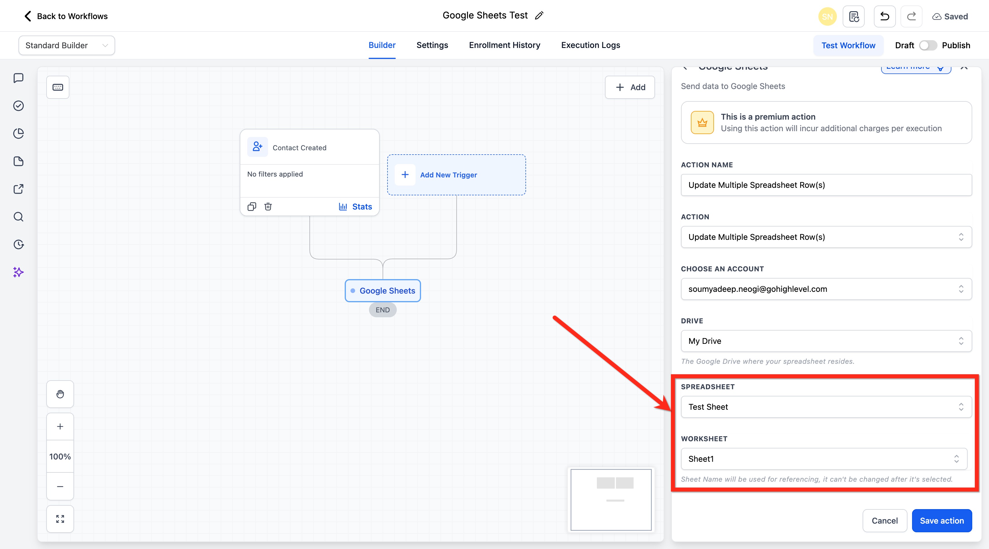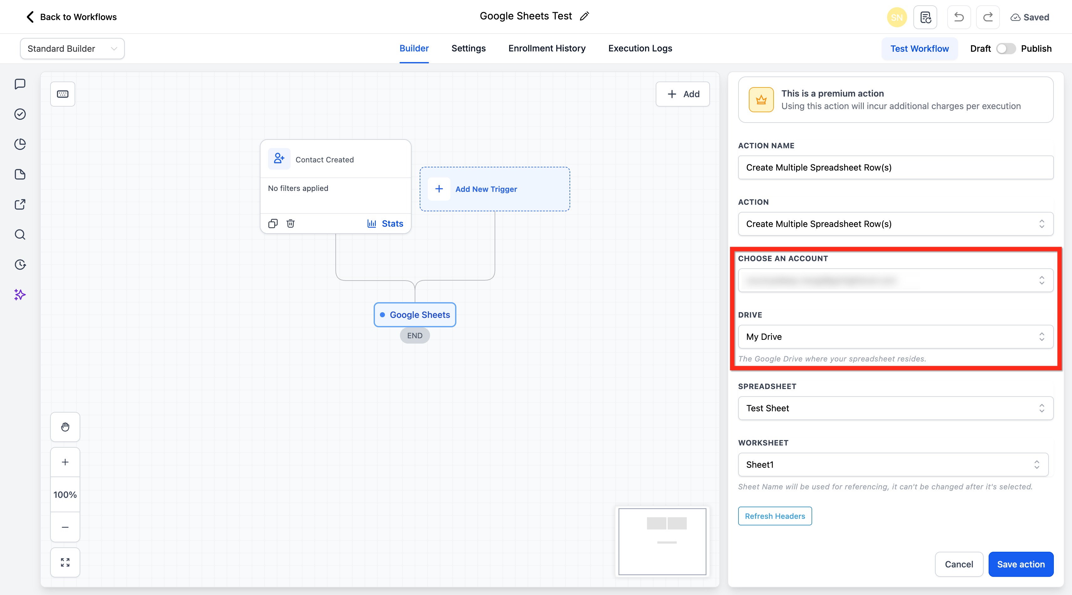 - Make sure Google Sheets premium workflow actions are enabled for the account (if required).