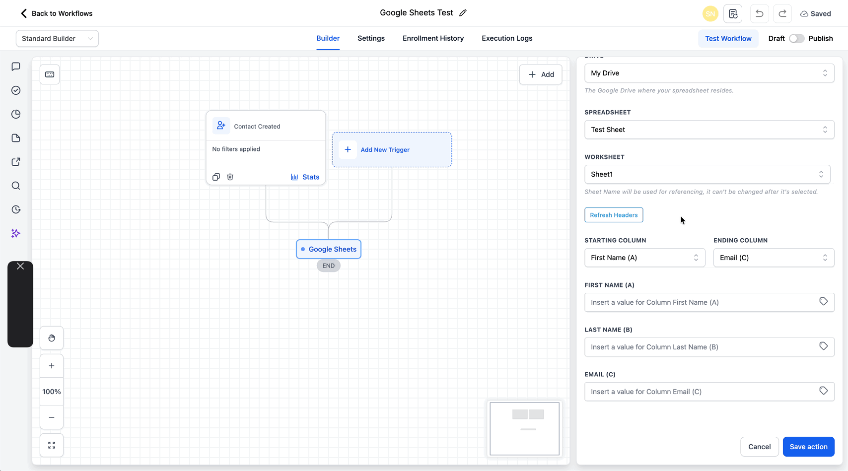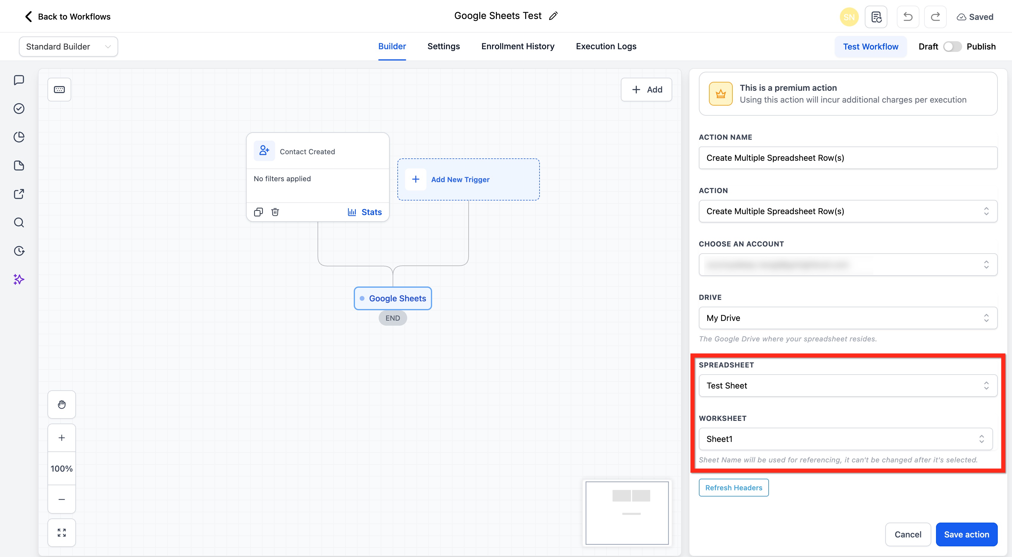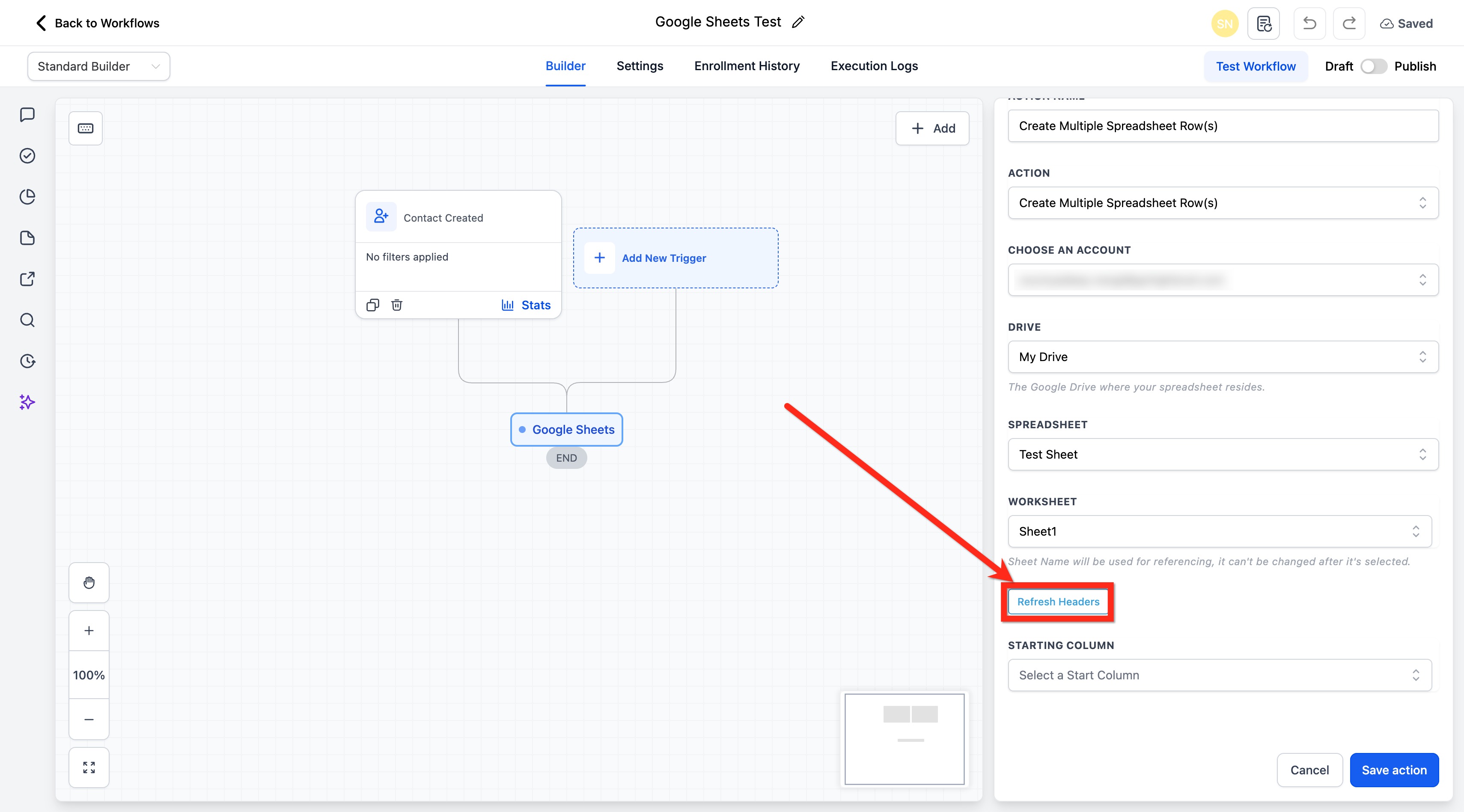 Click Refresh Headers after adding or renaming spreadsheet columns so the action pulls the latest sheet structure.