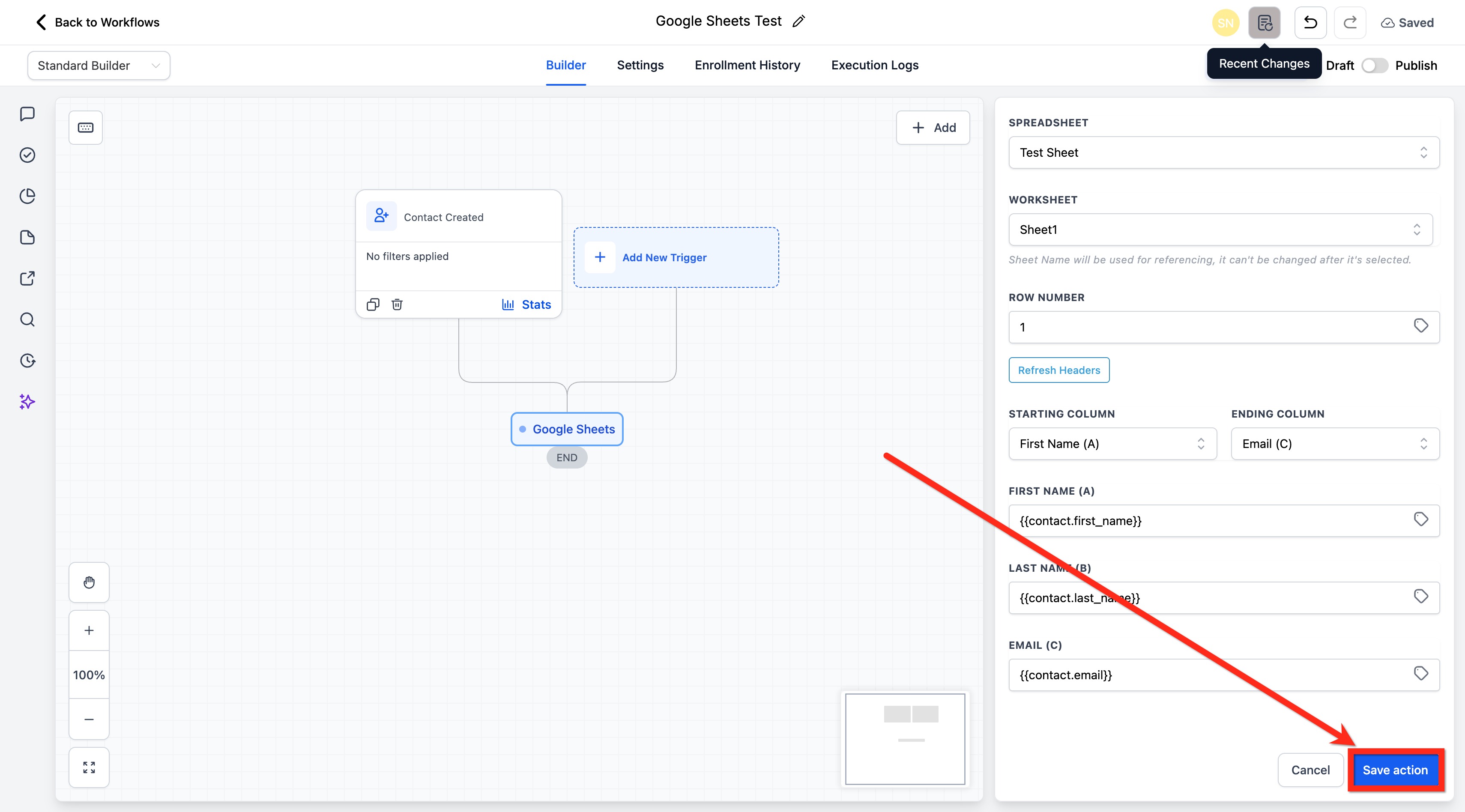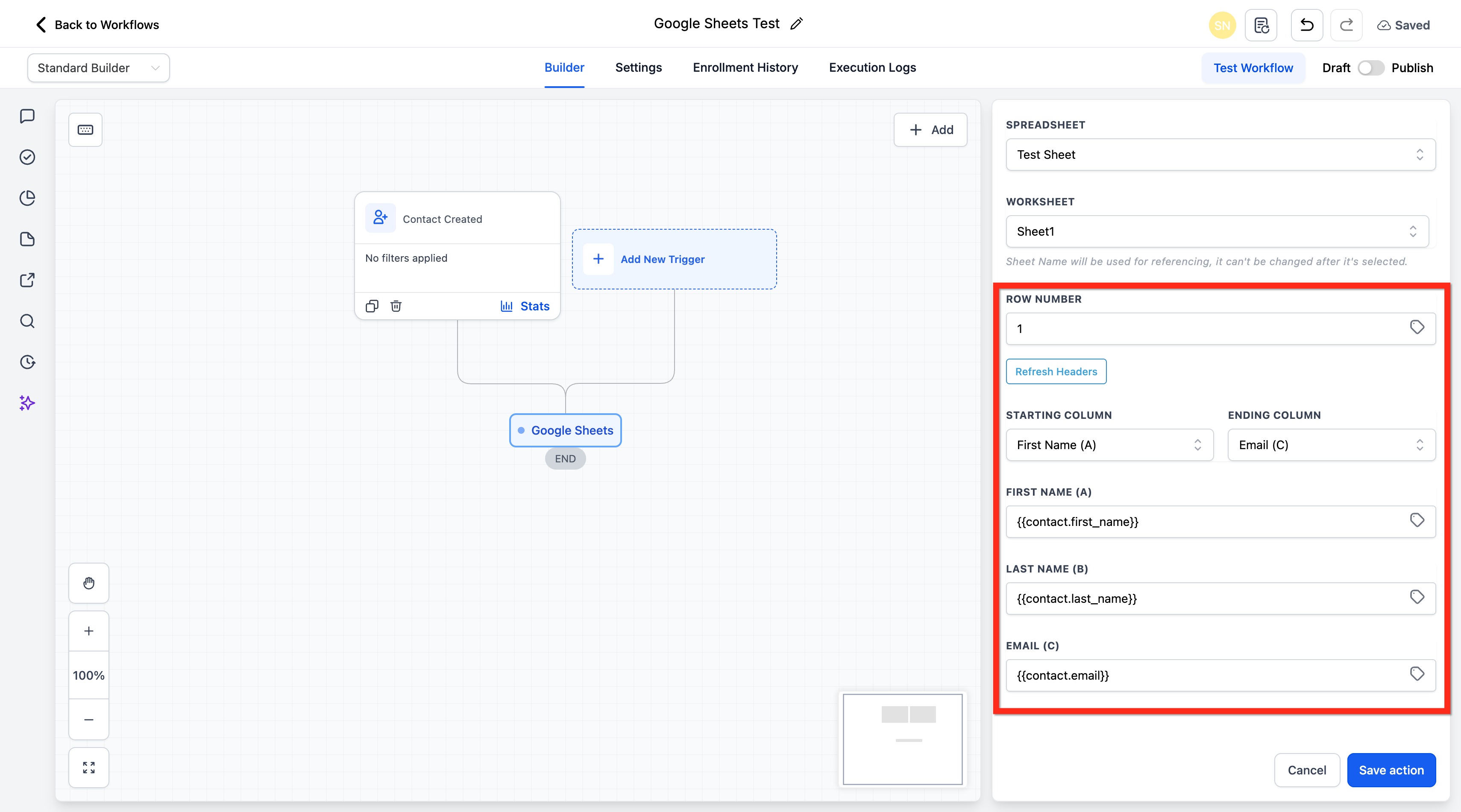 Refreshing headers updates the available column names inside the workflow action after spreadsheet changes.