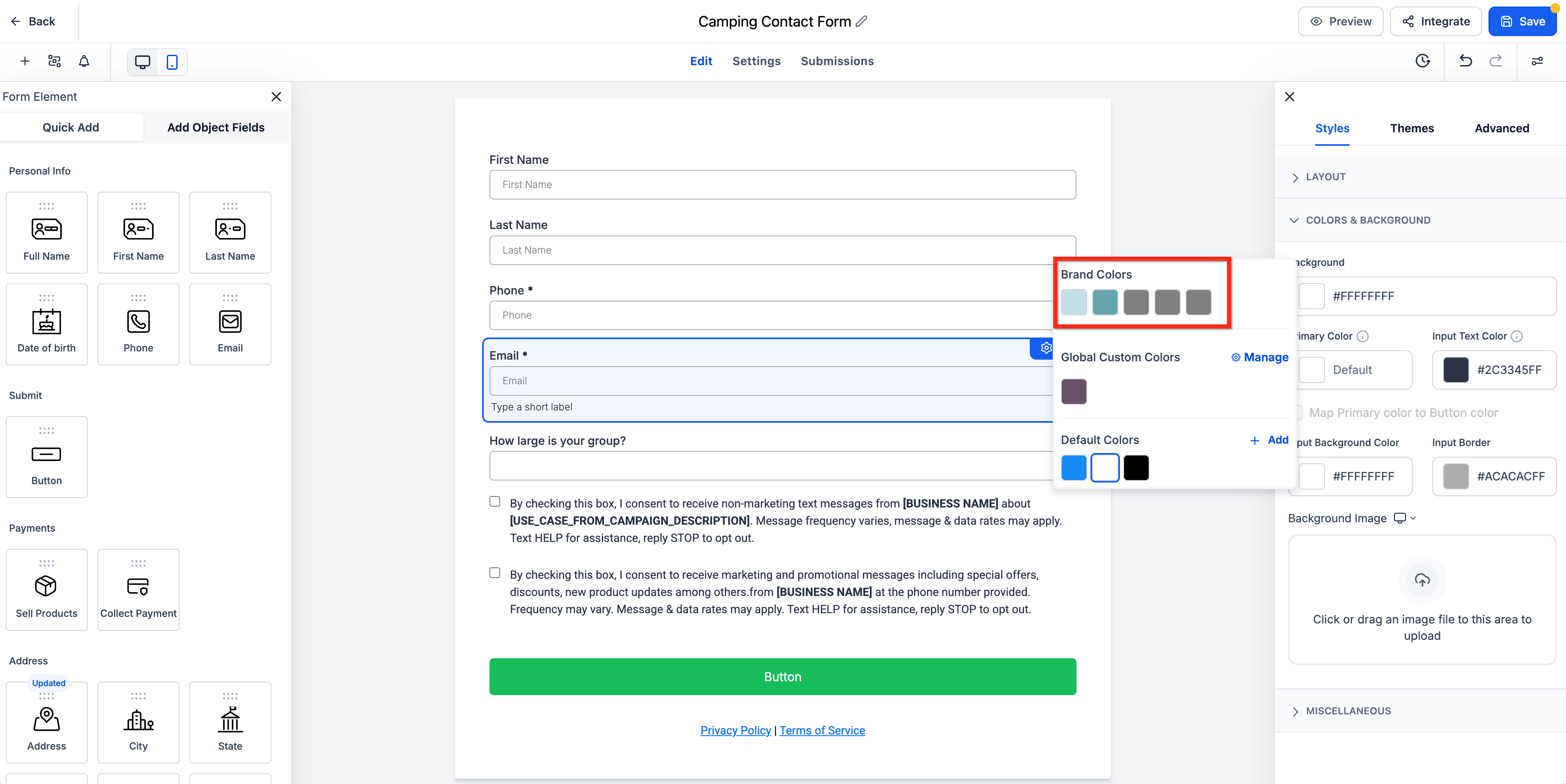 This feature connects your saved brand palette to the builder so you can apply approved colors without interrupting your workflow. It also reduces the need to manually match colors across forms and other assets.