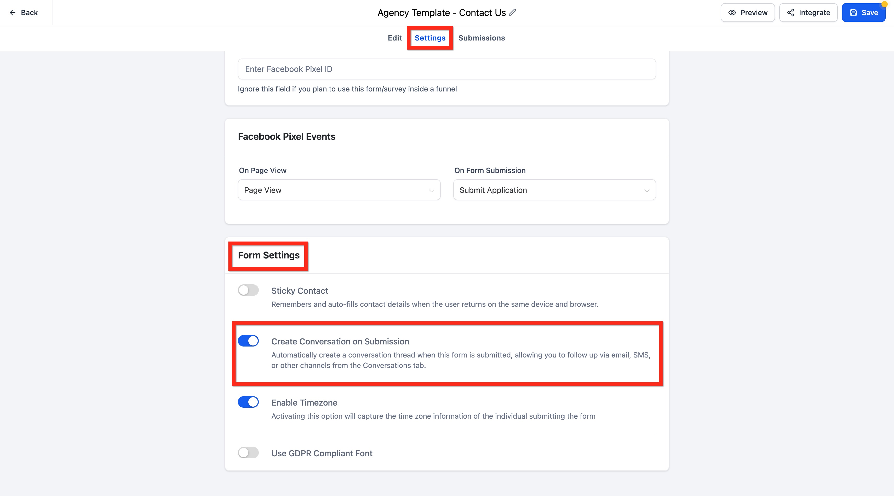 To ensure form submissions appear inside the conversation thread, you must enable a form-level setting. Then you can view the submission card inside the thread and optionally filter the inbox to find submission-based conversations.