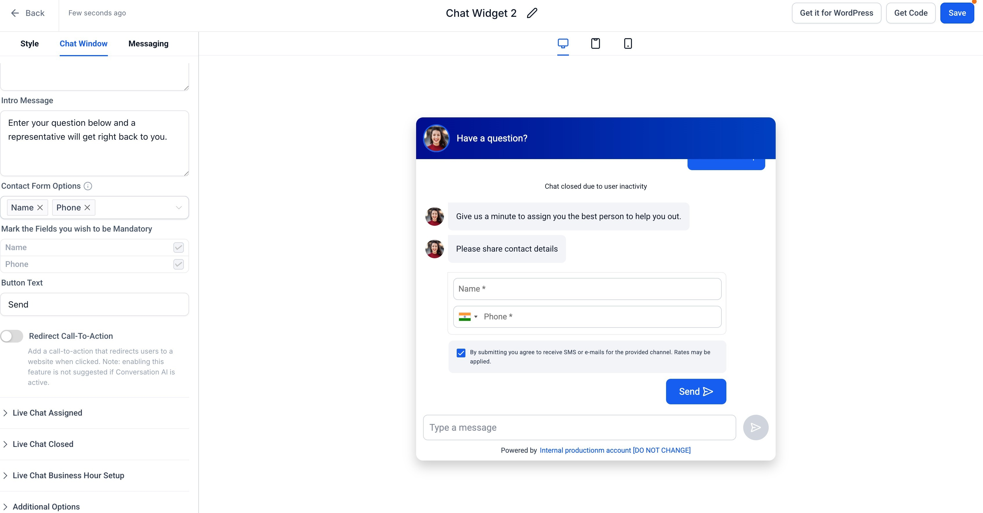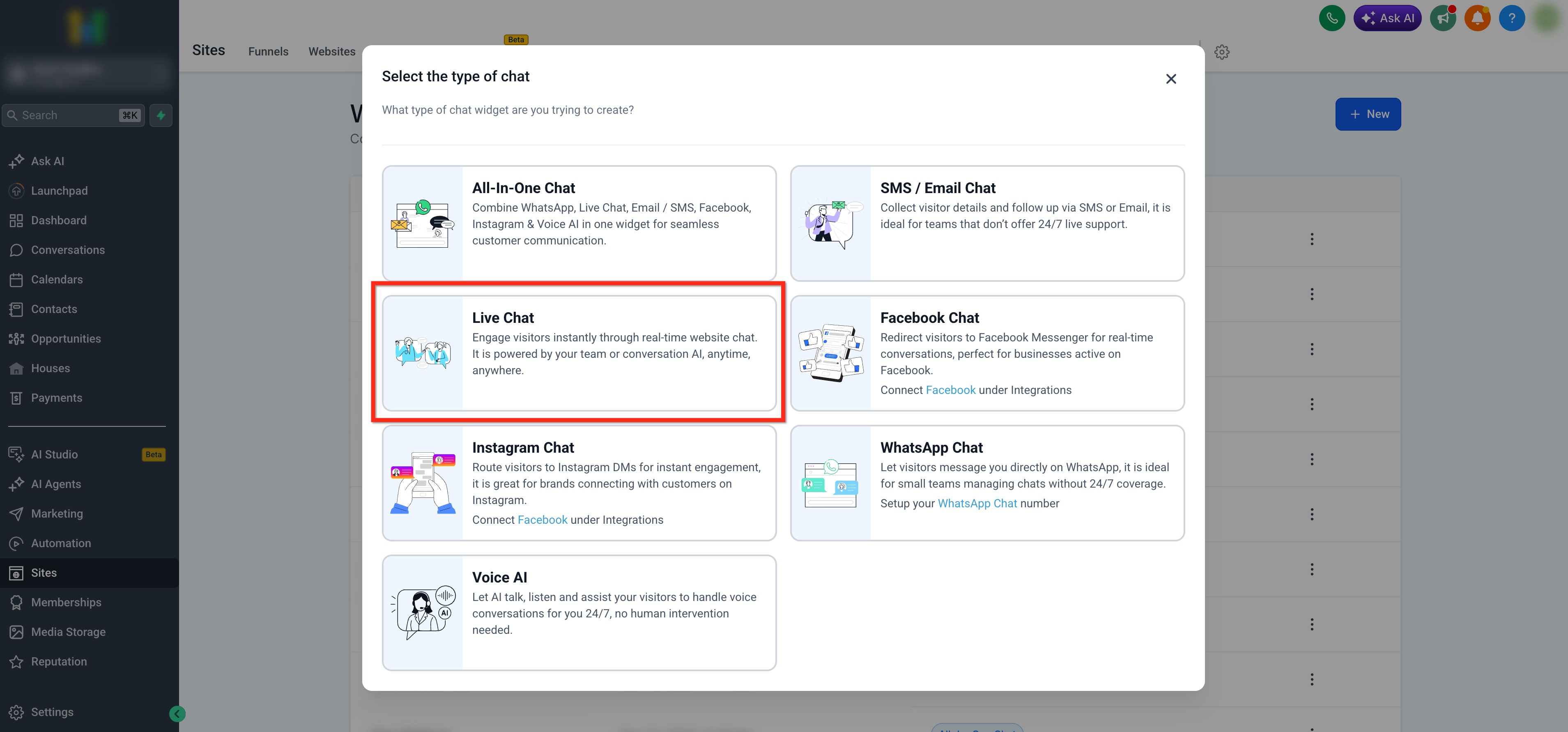 Go to Sites → Chat Widget, then click + New (or open an existing widget).