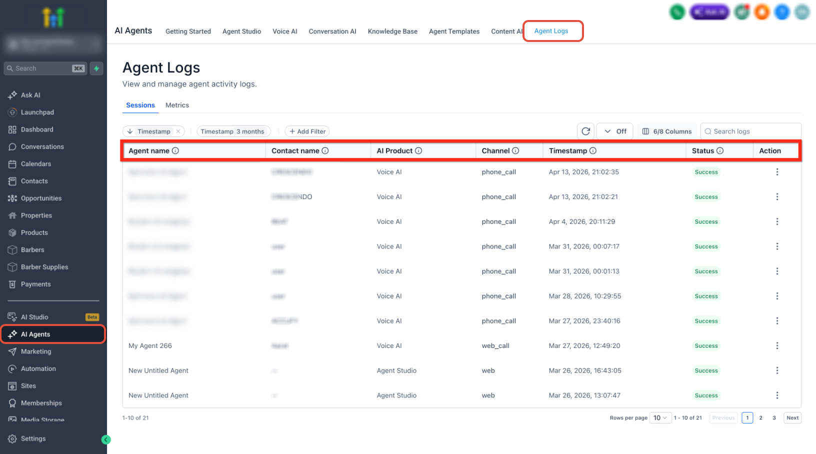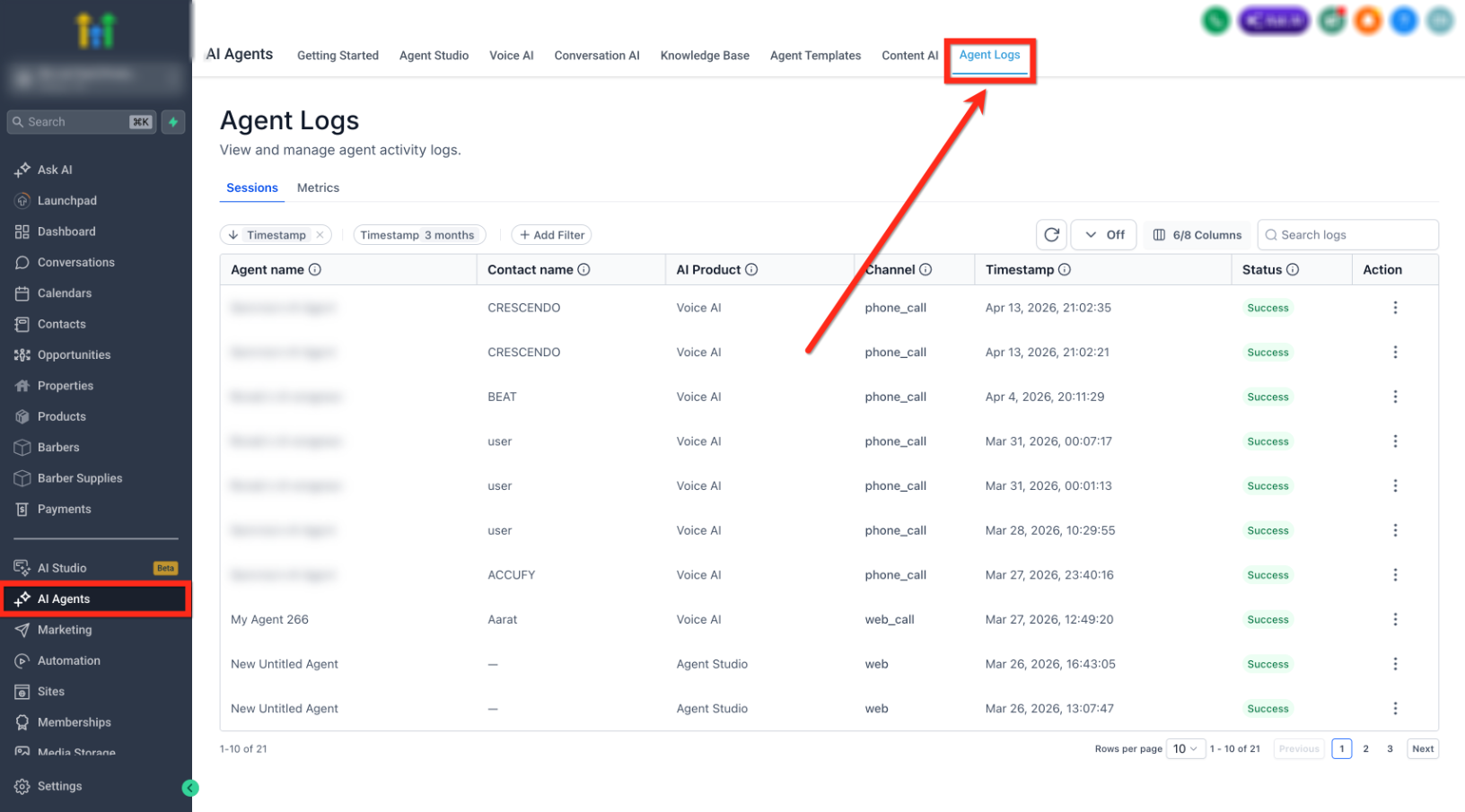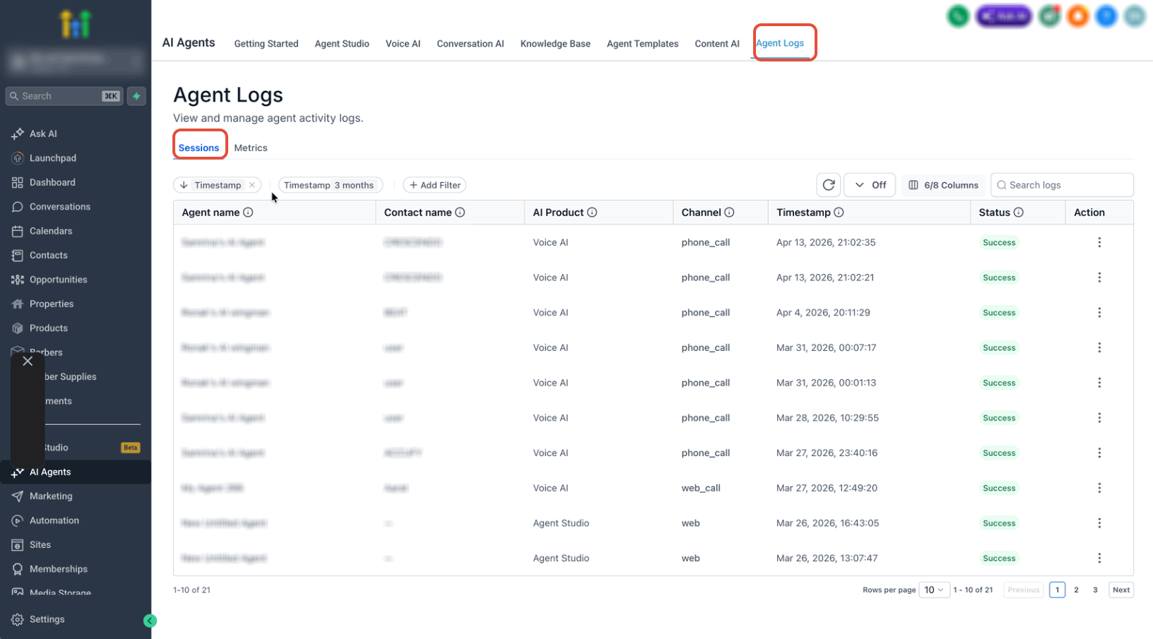 Agent Logs is a centralized view of AI interactions that shows conversation history, execution steps, timestamps, and system-level details. It allows you to analyze interactions from start to finish without guesswork.