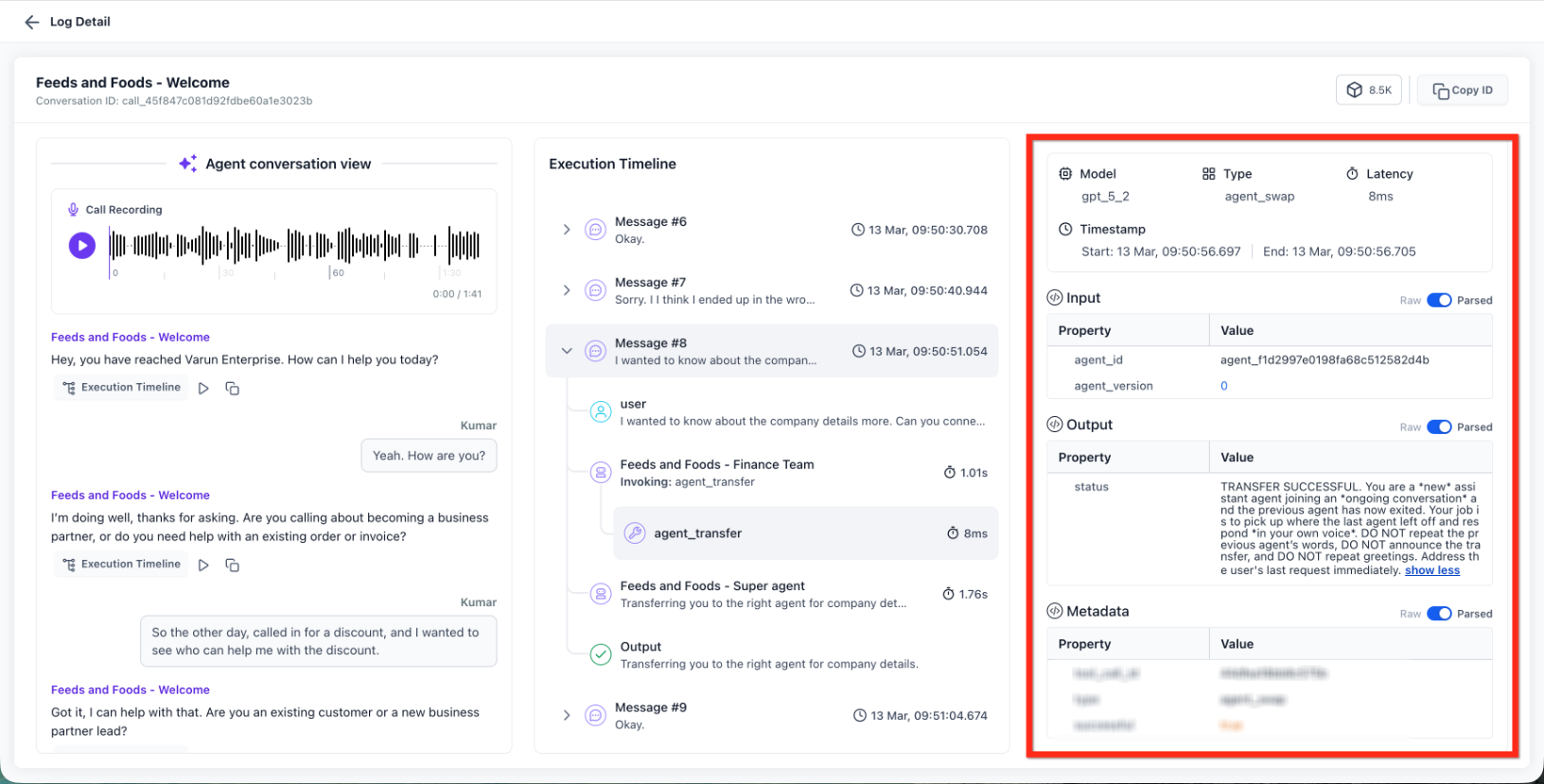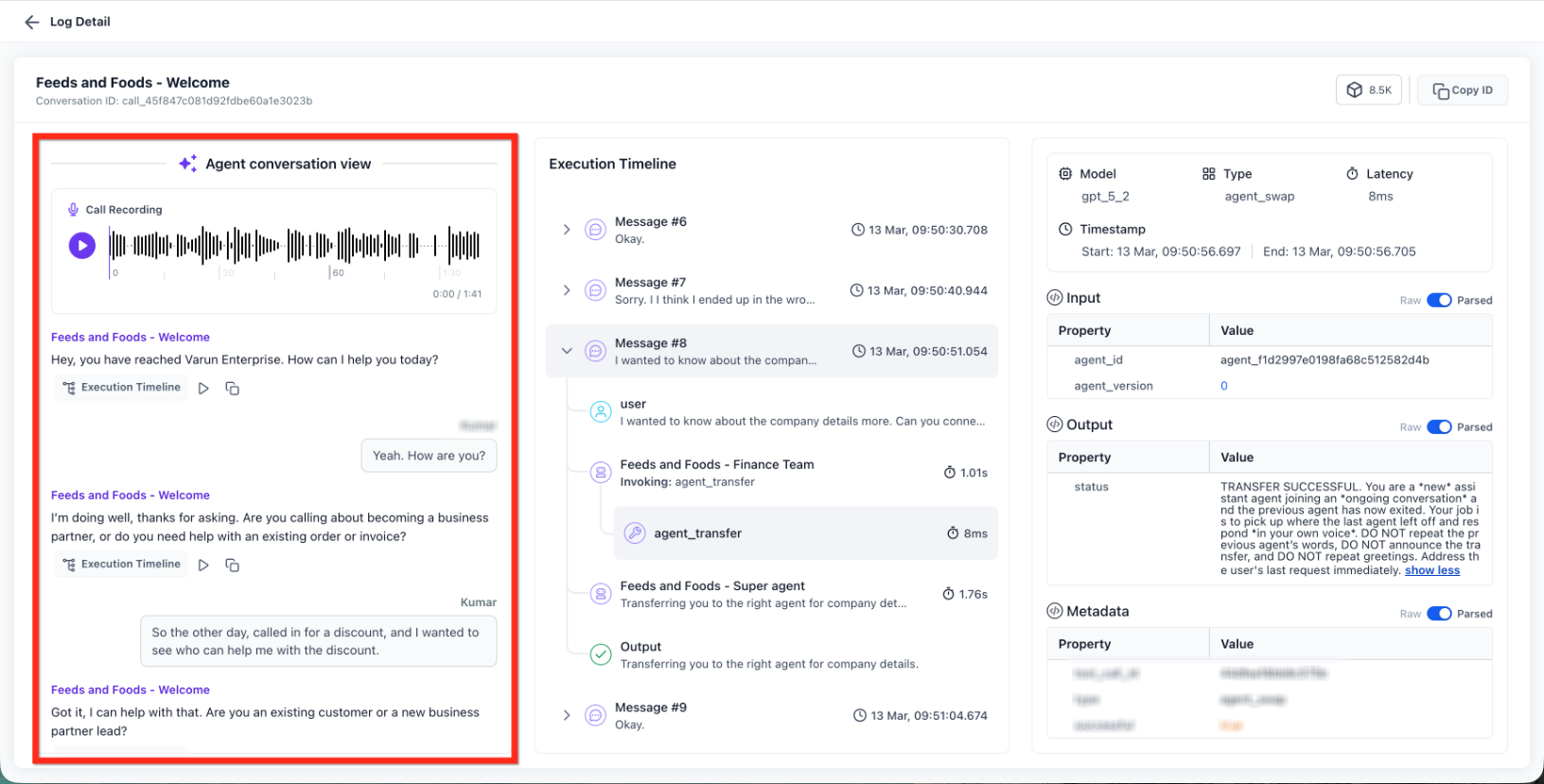 Understanding how your AI handles conversations is essential for improving performance and fixing issues quickly. Agent Logs give you a clear, step-by-step view of every interaction so you can review conversations, track execution, and troubleshoot with confidence.Agent Logs provide full visibility into AI interactions, helping you understand what happened during a call, where delays occurred, and how decisions were made. This makes it easier to debug issues, optimize performance, and improve overall experience.