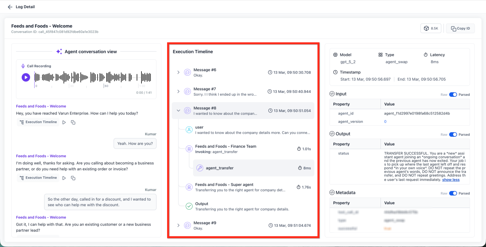 The conversation view shows the interaction as it happened, while the execution timeline shows the technical steps behind it.