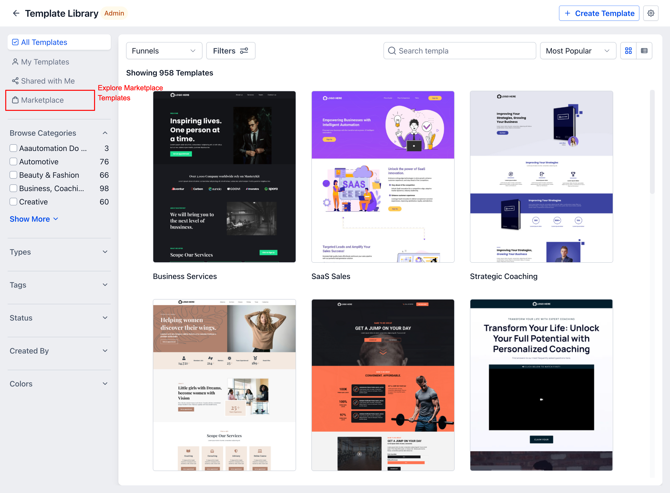 You can access them via Template Library → Marketplace tab or from the App Marketplace → Templates section.