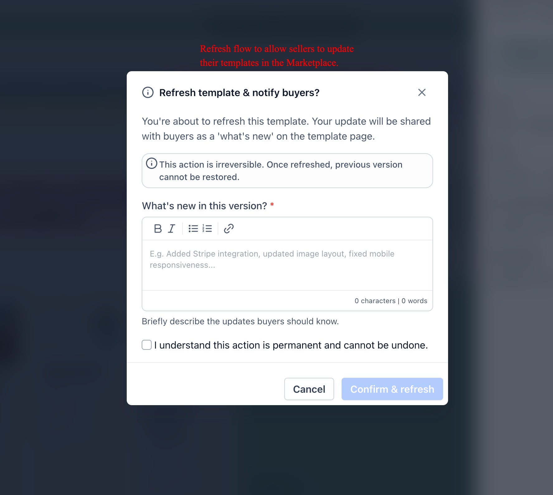 Creators can update/refresh templates and notify users via a “What’s New” section visible in template details.