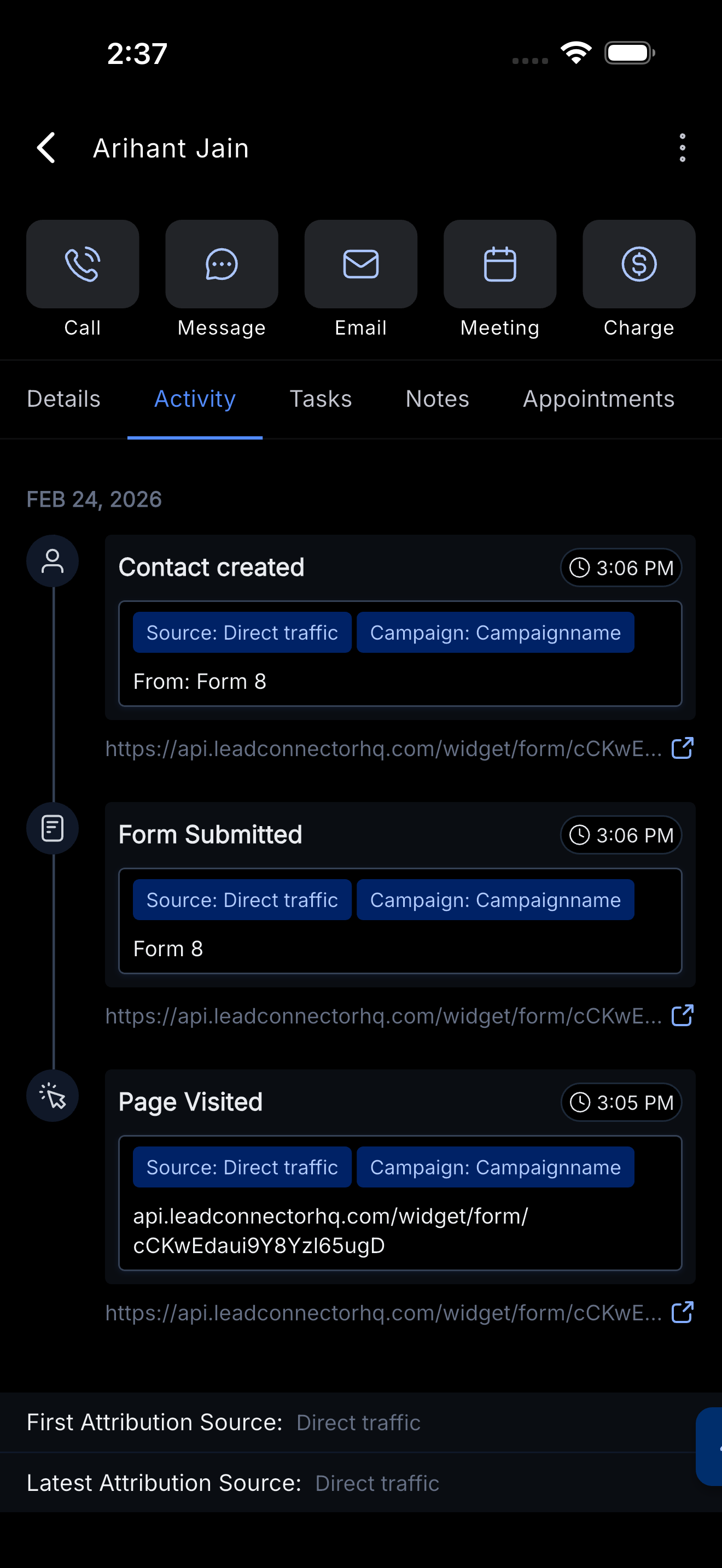 The mobile Activity tab is designed for fast, on-the-go contact context. Some activity details may differ from the web experience as parity between mobile and desktop continues to improve.