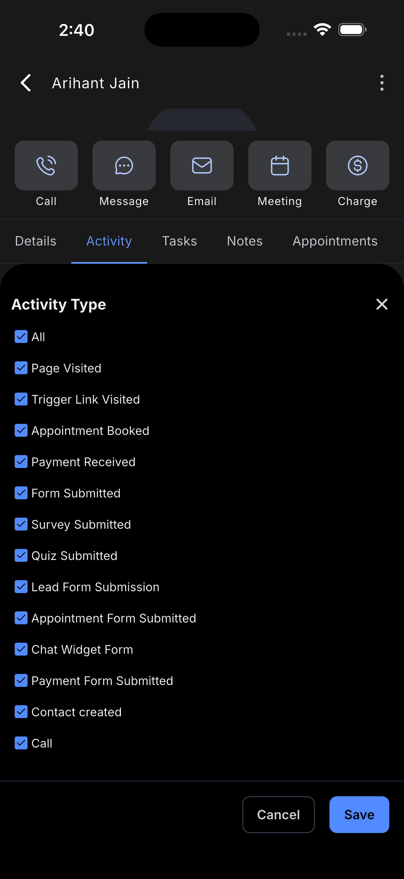 Filters help you narrow long activity timelines so you can find the most relevant contact events faster—especially for contacts with a large history of calls, form submissions, appointments, or other engagement.