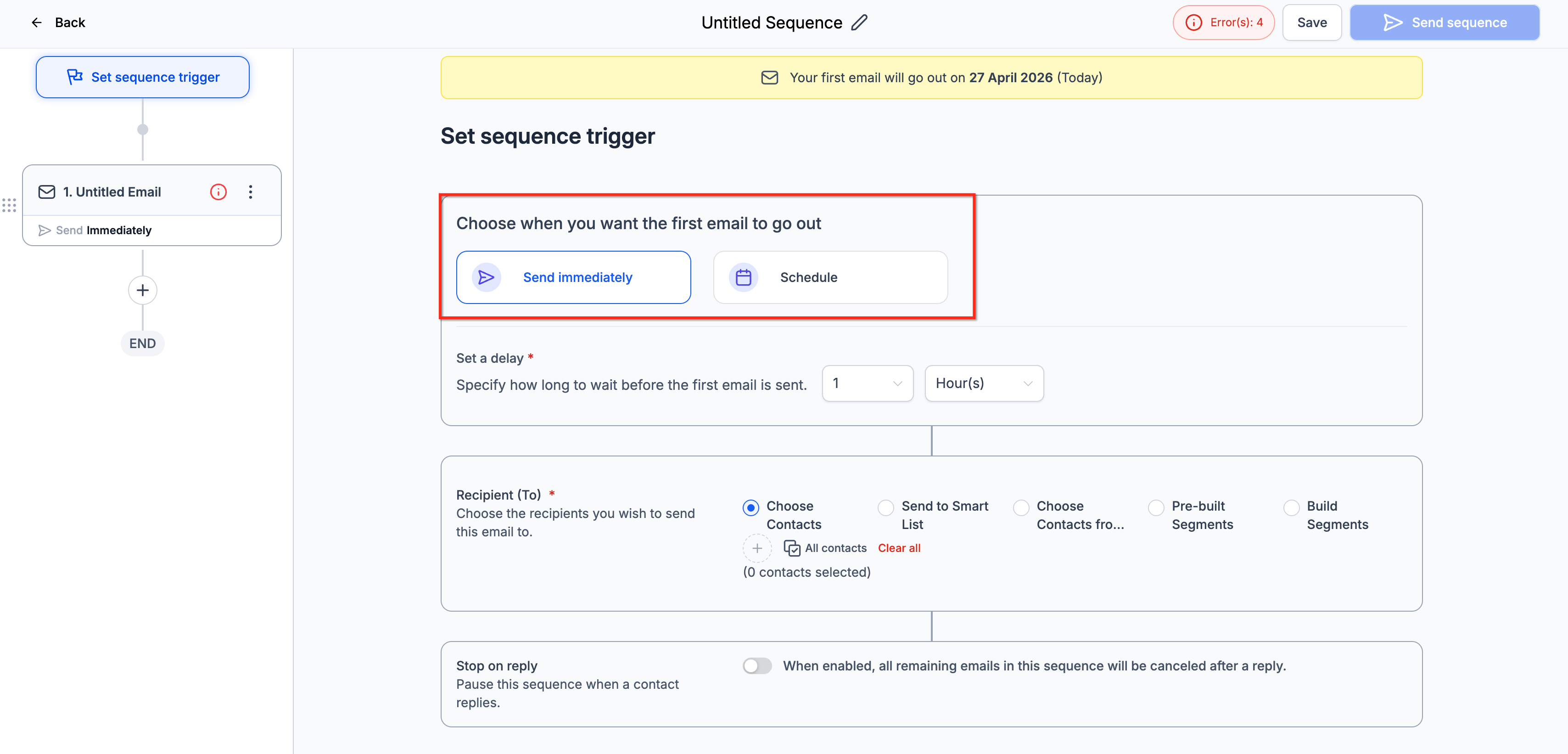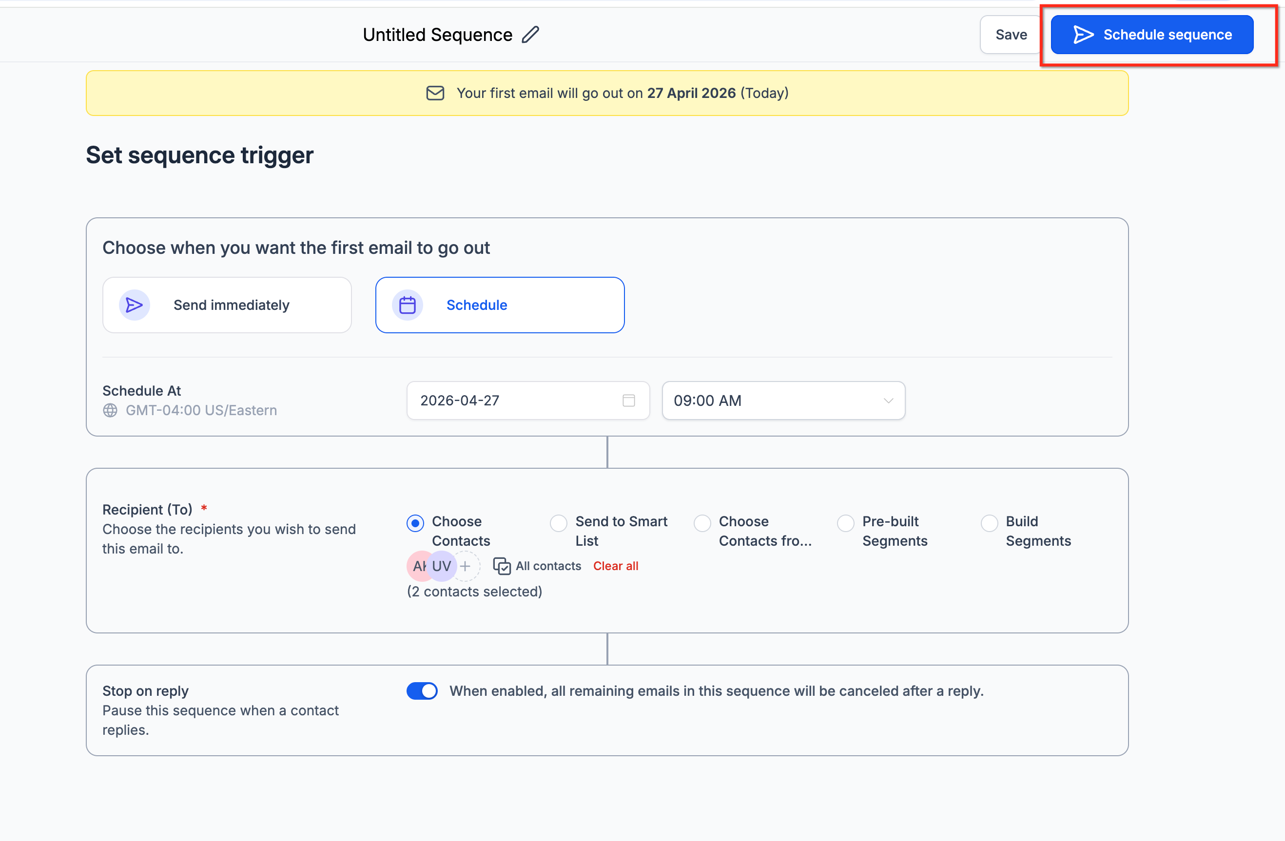 - Set the sequence trigger (start immediately or schedule for later).