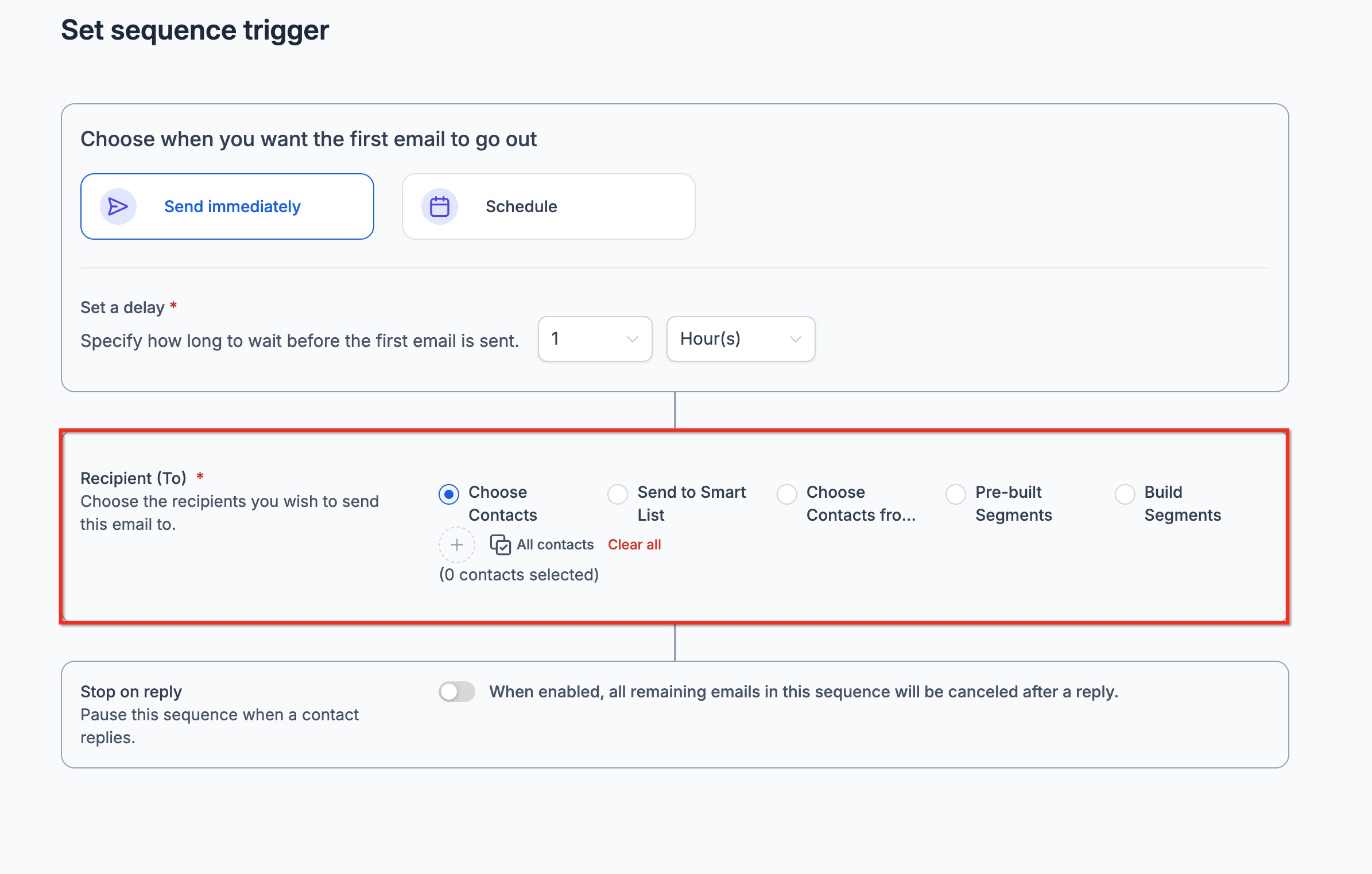 - Choose the sequence audience (select contacts, lists, or segments).