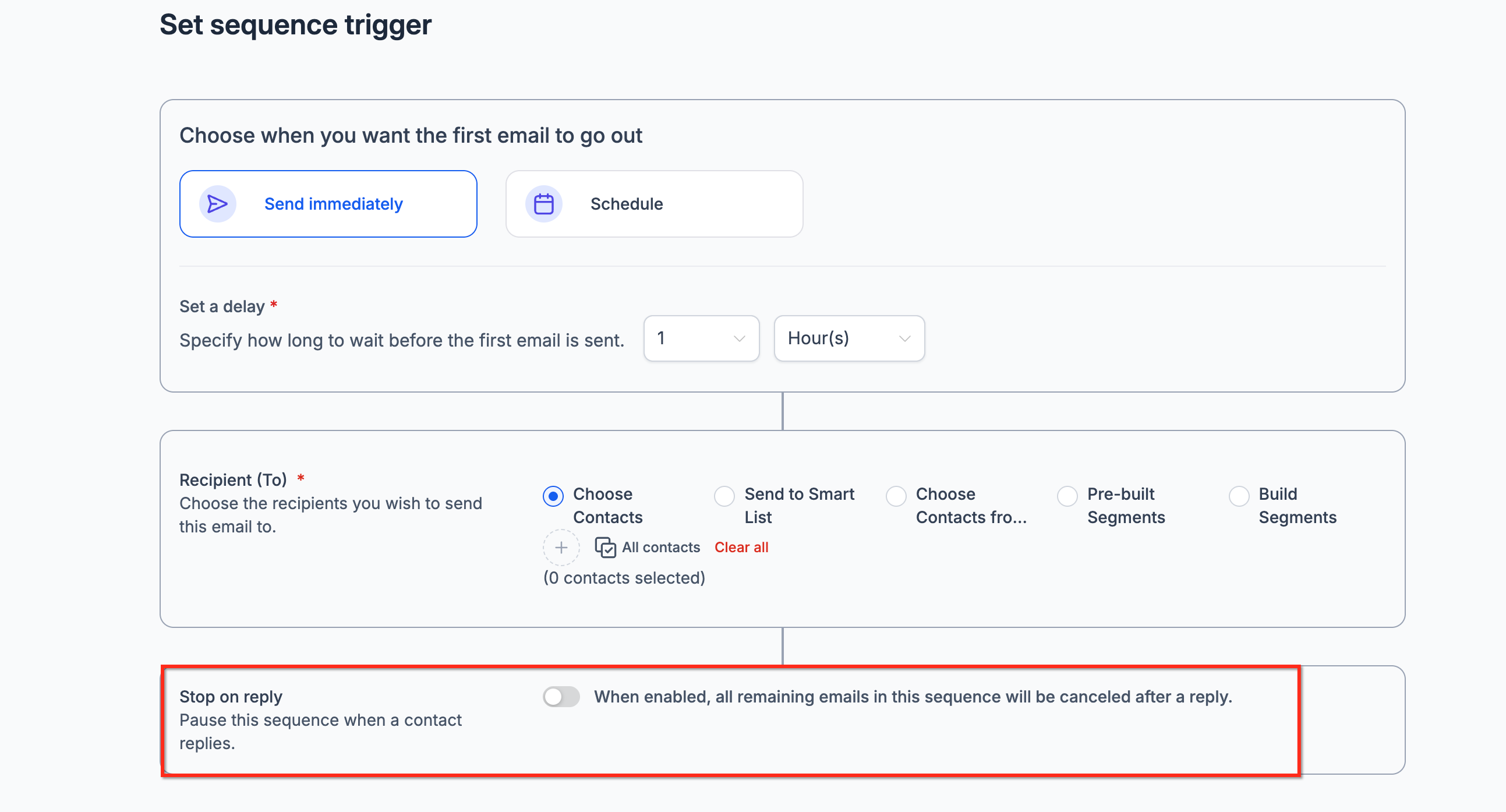Stop on Reply helps prevent contacts from receiving unnecessary follow-up emails after they respond. When enabled, the sequence stops sending future emails to a recipient once that recipient replies.
